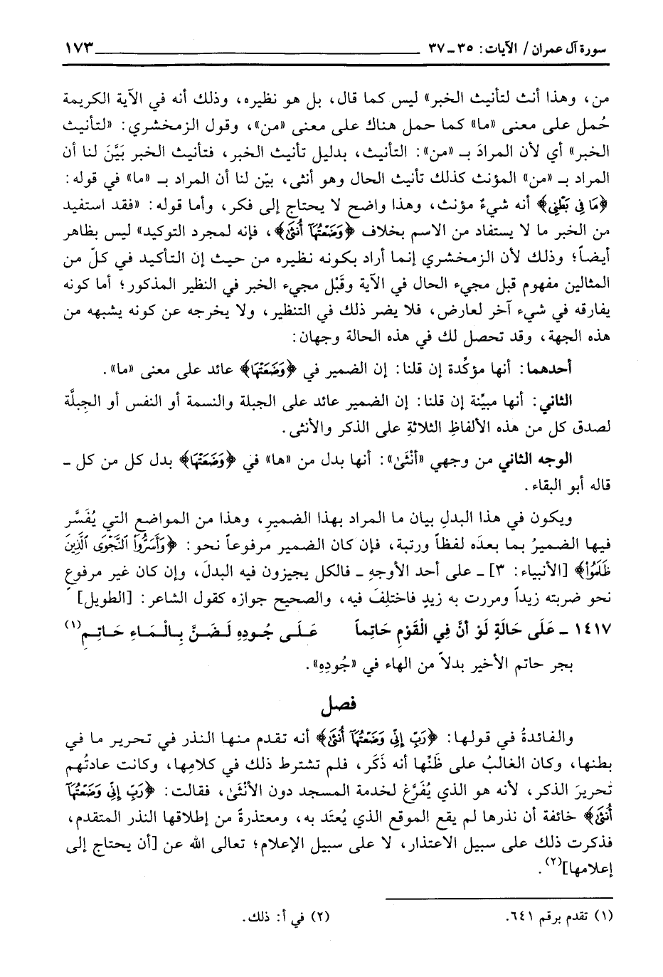 من، وهذا أنث لتأنيث الخبر «ليس كما قال، بل هو نظيره، وذلك أنه في الآية الكريمة حُمل على معنى» ما «كما حمل هناك على معنى» من «، وقول الزمخشري:» لتأنيث الخبر «أي لأن المرادَ ب» من «: التأنيث، بدليل تأنيث الخبر، فتأنيث الخبر بَيَّنَ لنا أن المراد ب» من «المؤنث كذلك تأنيث الحال وهو أنثى، بيّن لنا أن المراد ب» ما «في قوله: {مَا فِي بَطْنِي} أنه شيءٌ مؤنث، وهذا واضح لا يحتاج إلى فكر، وأما قوله:» فقد استفيد من الخبر ما لا يستفاد من الاسم بخلاف {وَضَعْتُهَآ أنثى} ، فإنه لمجرد التوكيد «ليس بظاهر أيضاً؛ وذلك لأن الزمخشري إنما أراد بكونه نظيره من حيث إن التأكيد في كلّ من المثالين مفهوم قبل مجيء الحال في الآية وقَبْل مجيء الخبر في النظير المأما كونه يفارقه في شيء آخر لعارض، فلا يضر ذلك في التنظير، ولا يخرجه عن كونه يشبهه من هذه الجهة، وقد تحصل لك في هذه الحالة وجهان: