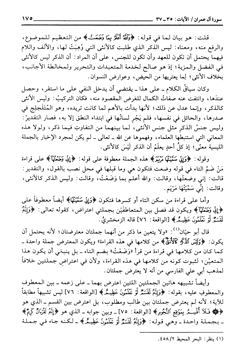قال أبو حيّان: «ولا يتعين ما ذكر من أنهما جملتان معترضتان؛ لأنه يحتمل أن يكون: {وَلَيْسَ الذكر كالأنثى} من كلامها في هذه القراءة» ويكون المعترض جملة واحدة - كما كان من كلامها في قراءة من قرأ «وَضَعْتُ» بضم التاء - بل ينبغي أن يكون هذا المتعيِّن؛ لثبوت كونه من كلامها في هذه القراءة، ولأن في اعتراضِ جملتين خلافاً لمذهب أبي علي الفارسي من أنه لا يعترض جملتان.
