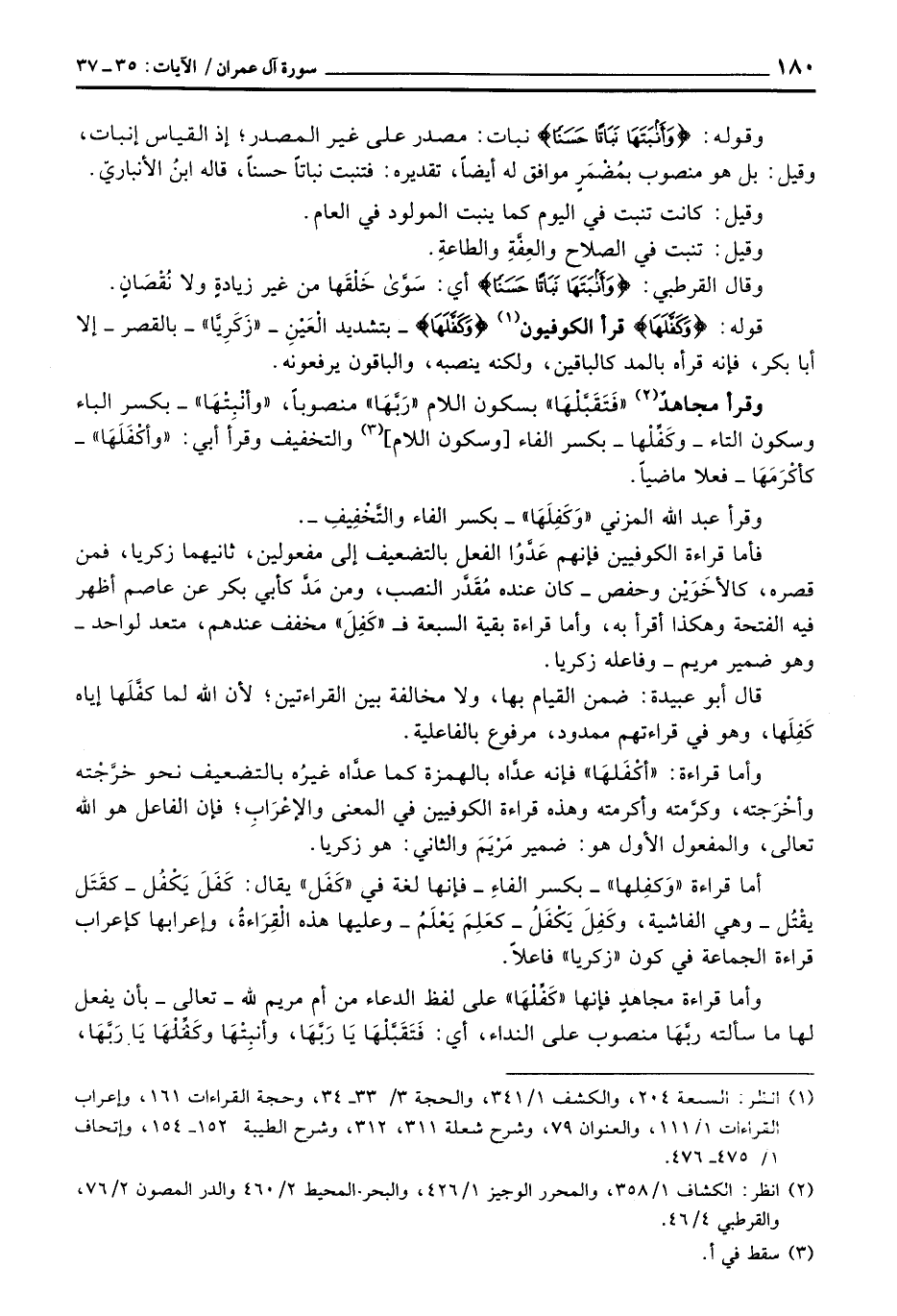 قوله: {وَكَفَّلَهَا} قرأ الكوفيون {وَكَفَّلَهَا} - بتشديد الْعَيْنِ - «زَكَرِيَّا» - بالقصر - إلا أبا بكر، فإنه قرأه بالمد كالباقين، ولكنه ينصبه، والباقون يرفعونه.