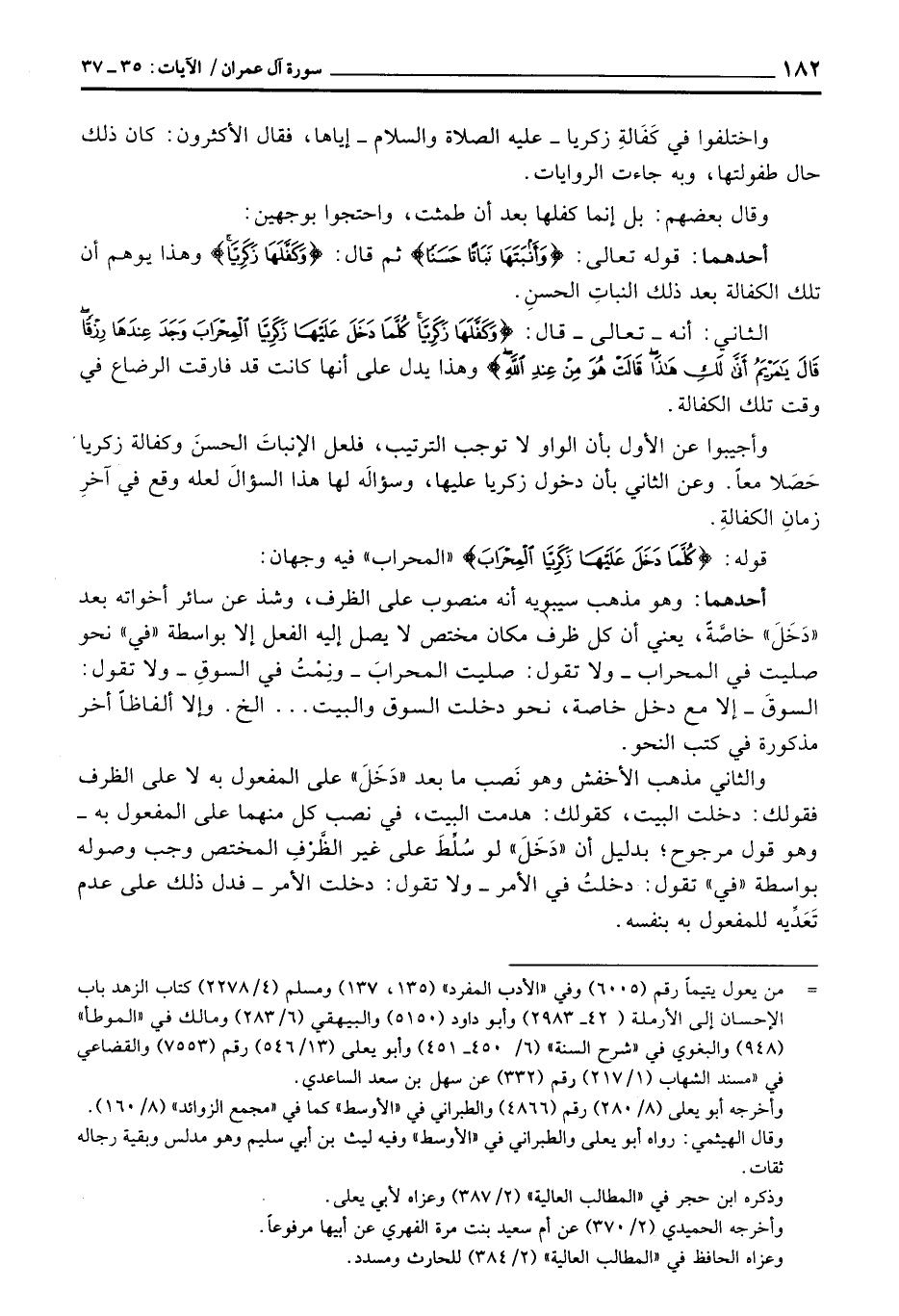 وأجيبوا عن الأول بأن الواو لا توجب الترتيب، فلعل الإنباتَ الحسنَ وكفالة زكريا حَصَلا معاً. وعن الثاني بأن دخول زكريا عليها، وسؤالَه لها هذا السؤالَ لعله وقع في آخرِ زمانِ الكفالةِ.