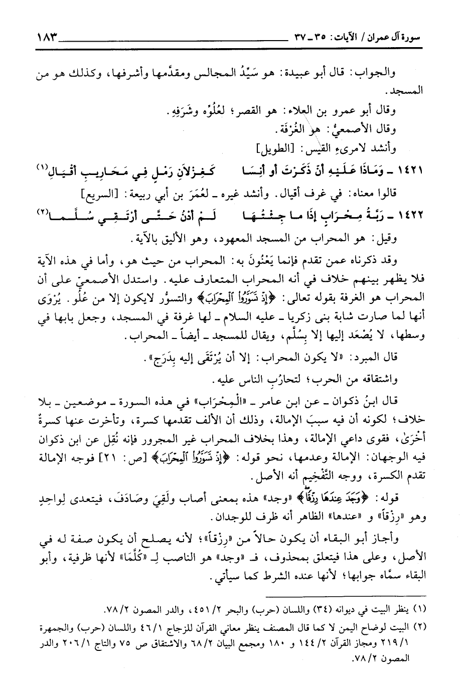 وقد ذكرناه عمن تقدم فإنما يَعْنُونَ به: المحراب من حيث هو، وأما في هذه الآية فلا يظهر بينهم خلاف في أنه المحراب المتعارف عليه. واستدل الأصمعيّ على أن المحراب هو الغرفة بقوله تعالى: {إِذْ تَسَوَّرُواْ المحراب} [ص: 21] فوجه الإمالة تقدم الكسرة، ووجه التَّفْخِيم أنه الأصل.