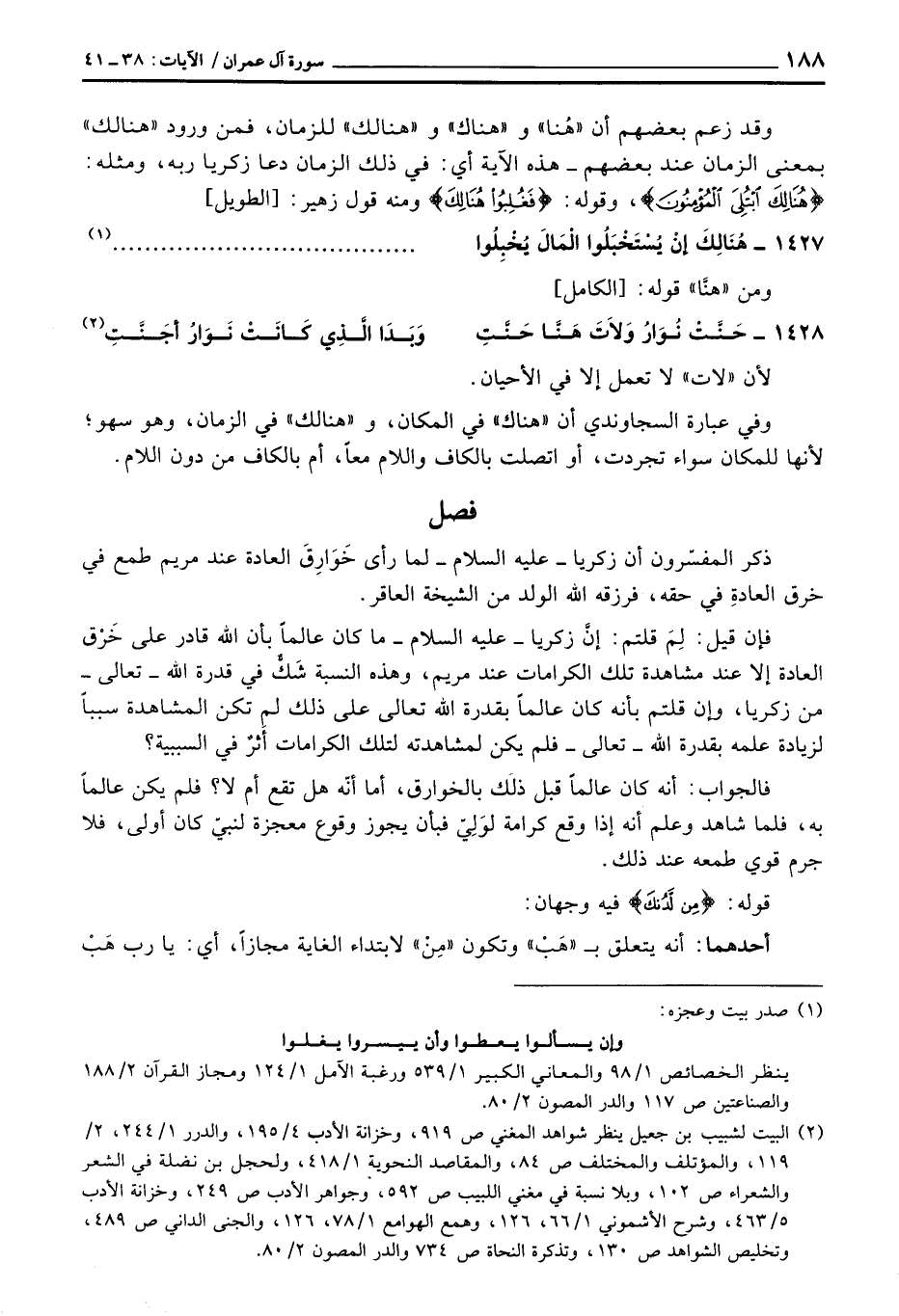 وقد زعم بعضهم أن «هُنا» و «هناك» و «هنالك» للزمان، فمن ورود «هنالك» بمعنى الزمان عند بعضهم - هذه الآية أي: في ذلك الزمان دعا زكريا ربه، ومثله: {هُنَالِكَ ابتلي المؤمنون} [الأحزاب: 11] ، وقوله: {فَغُلِبُواْ هُنَالِكَ} ومنه قول زهير: [الطويل]
