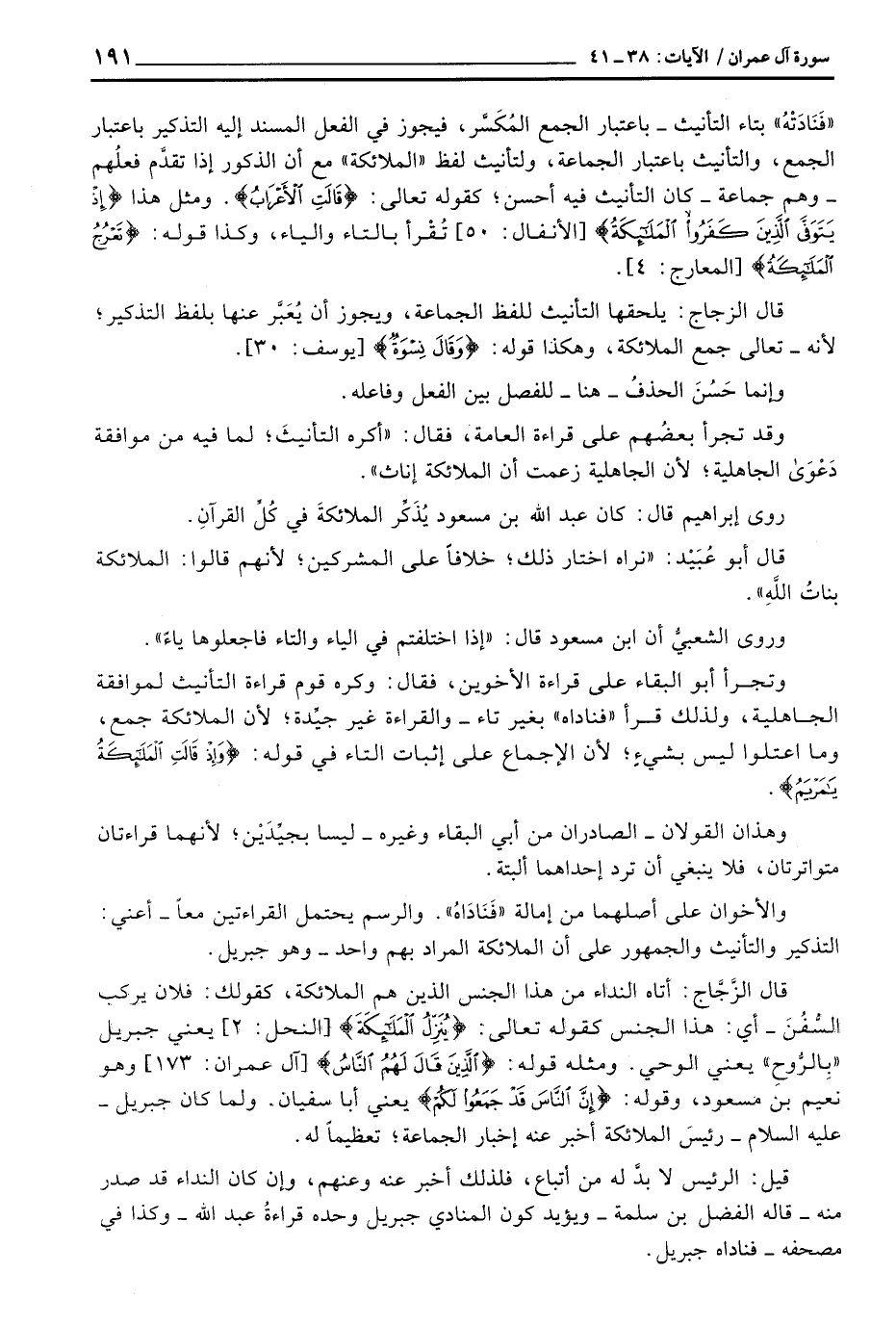 وتجرأ أبو البقاء على قراءة الأخوين، فقال: وكره قوم قراءة التأنيث لموافقة الجاهلية، ولذلك قرأ «فناداه» بغير تاء - والقراءة غير جيِّدة؛ لأن الملائكة جمع، وما اعتلوا ليس بشيءٍ؛ لأن الإجماع على إثبات التاء في قوله: {وَإِذْ قَالَتِ الملائكة يامريم} [آل عمران: 42] .