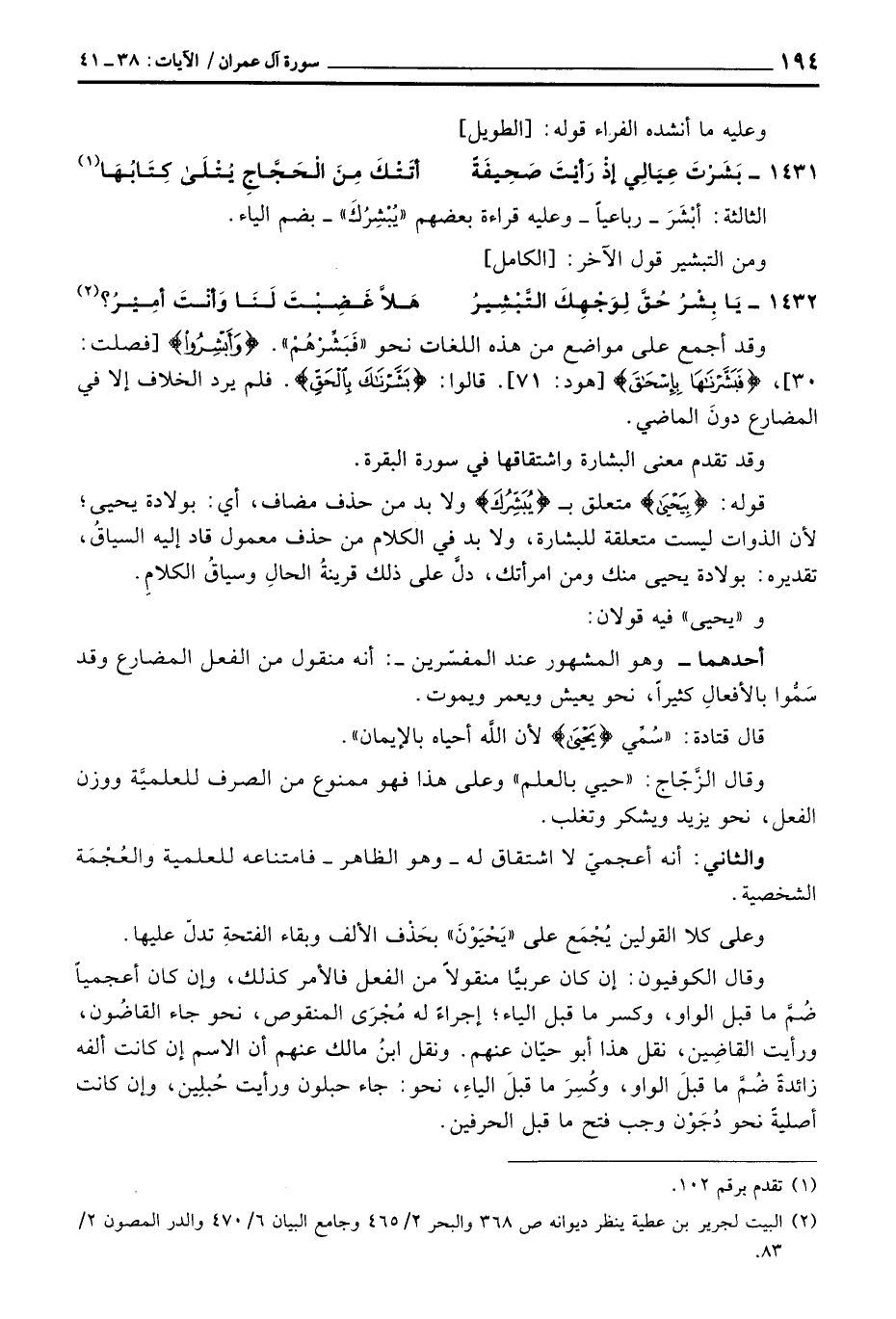 قوله: {بيحيى} متعلق ب {يُبَشِّرُكَ} ولا بد من حذف مضاف، أي: بولادة يحيى؛ لأن الذوات ليست متعلقة للبشارة، ولا بد في الكلام من حذف معمول قاد إليه السياقُ، تقديره: بولادة يحيى منك ومن امرأتك، دلَّ على ذلك قرينةُ الحالِ وسياقُ الكلامِ.