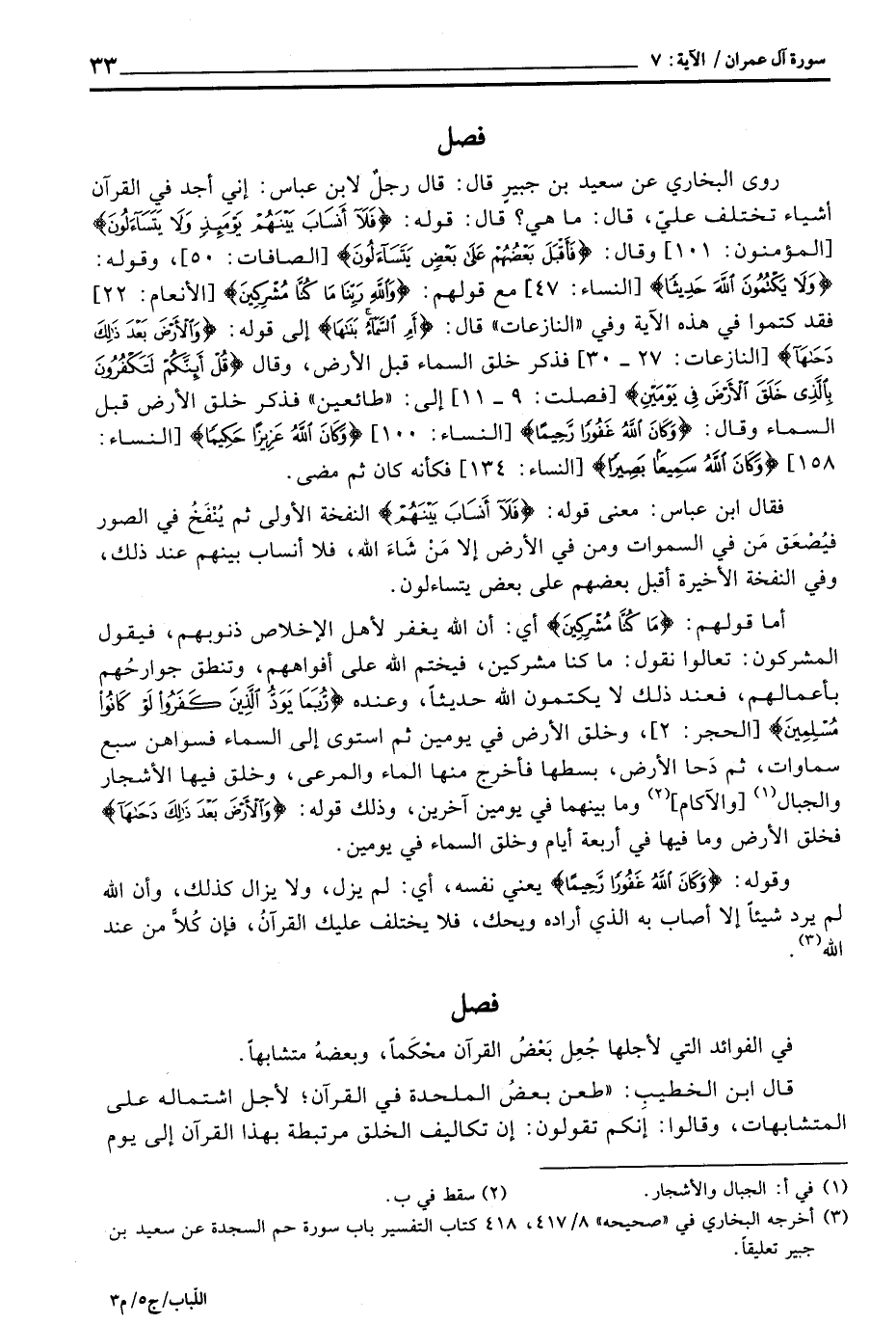 روى البخاري عن سعيد بن جبيرٍ قال: قال رجلٌ لابن عباس: إني أجد في القرآن أشياء تختلف عليّ، قال: ما هي؟ قال: قوله: {فَلاَ أَنسَابَ بَيْنَهُمْ يَوْمَئِذٍ وَلاَ يَتَسَآءَلُونَ} [المؤمنون: 101] وقال: {فَأَقْبَلَ بَعْضُهُمْ على بَعْضٍ يَتَسَآءَلُونَ} [الصافات: 50] ، وقوله: {وَلاَ يَكْتُمُونَ الله حَدِيثاً} [النساء: 42] مع قولهم: {والله رَبِّنَا مَا كُنَّا مُشْرِكِينَ} [الأنعام: 23] فقد كتموا في هذه الآية وفي «النازعات» قال: {أَمِ السمآء بَنَاهَا} [النازعات: 27] إلى قوله: {والأرض بَعْدَ ذَلِكَ دَحَاهَا} [النازعات: 27 - 30] فذكر خلق السماء قبل الأرض، وقال {قُلْ أَإِنَّكُمْ لَتَكْفُرُونَ بالذي خَلَقَ الأرض فِي يَوْمَيْنِ} [فصلت: 9 - 11] إلى: «طَآئِعِينَ» فذكر خلق الأرض قبل السماء وقال: {وَكَانَ الله غَفُوراً رَّحِيماً} [النساء: 100] {وَكَانَ الله عَزِيزاً حَكِيماً} [النساء: 158] {وَكَانَ الله سَمِيعاً بَصِيراً} [النساء: 134] فكأنه كان ثم مضى.