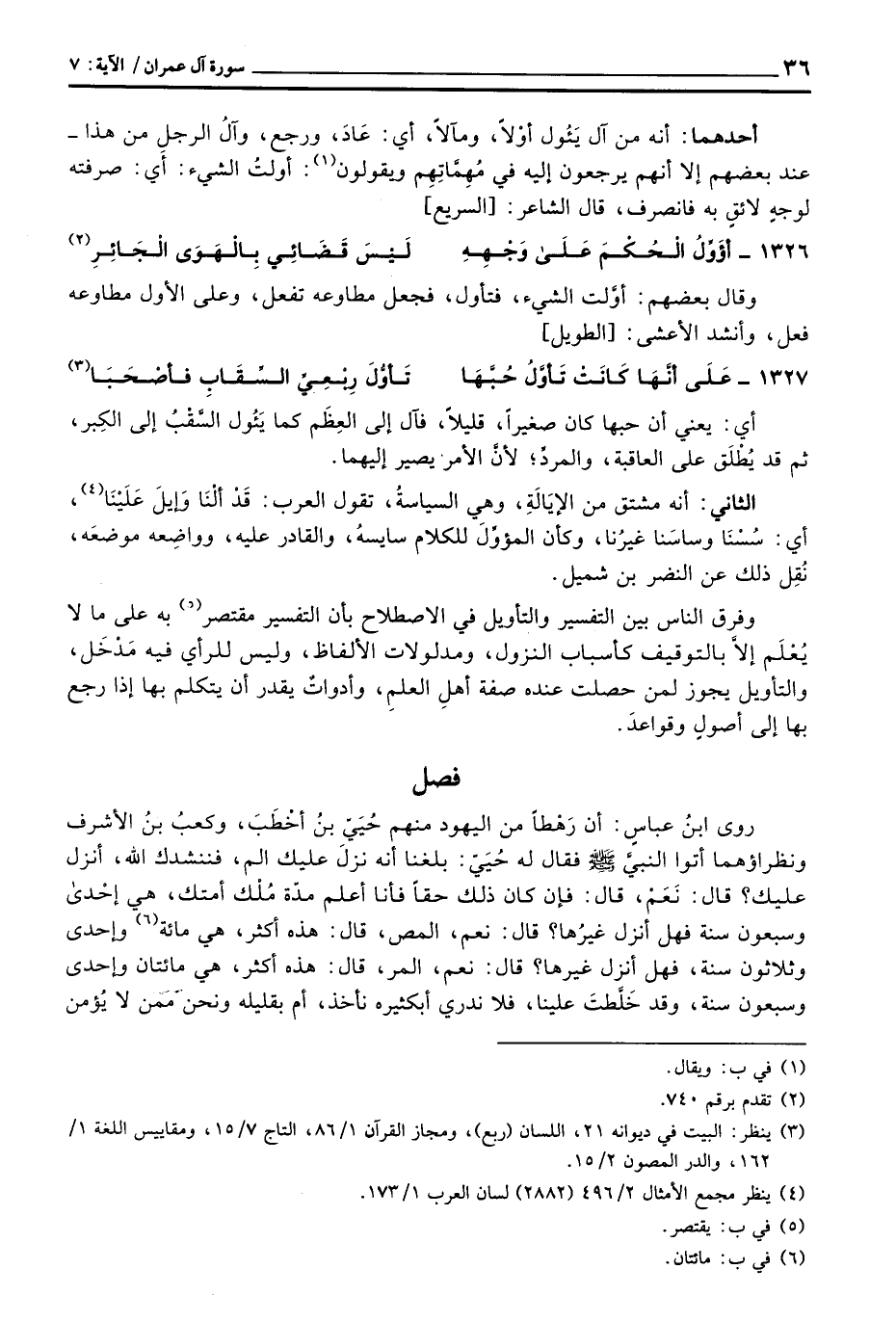 وفرق الناس بين التفسير والتأويل في الاصطلاح بأن التفسير مقتصر به على ما لا يُعْلَم إلاَّ بالتوقيف كأسباب النزول، ومدلولات الألفاظ، وليس للرأي فيه مَدْخَل، والتأويل يجوز لمن حصلت عنده صفة أهلِ العلمِ، وأدواتٌ يقدر أن يتكلم بها إذا رجع بها إلى أصولٍ وقواعدَ.
