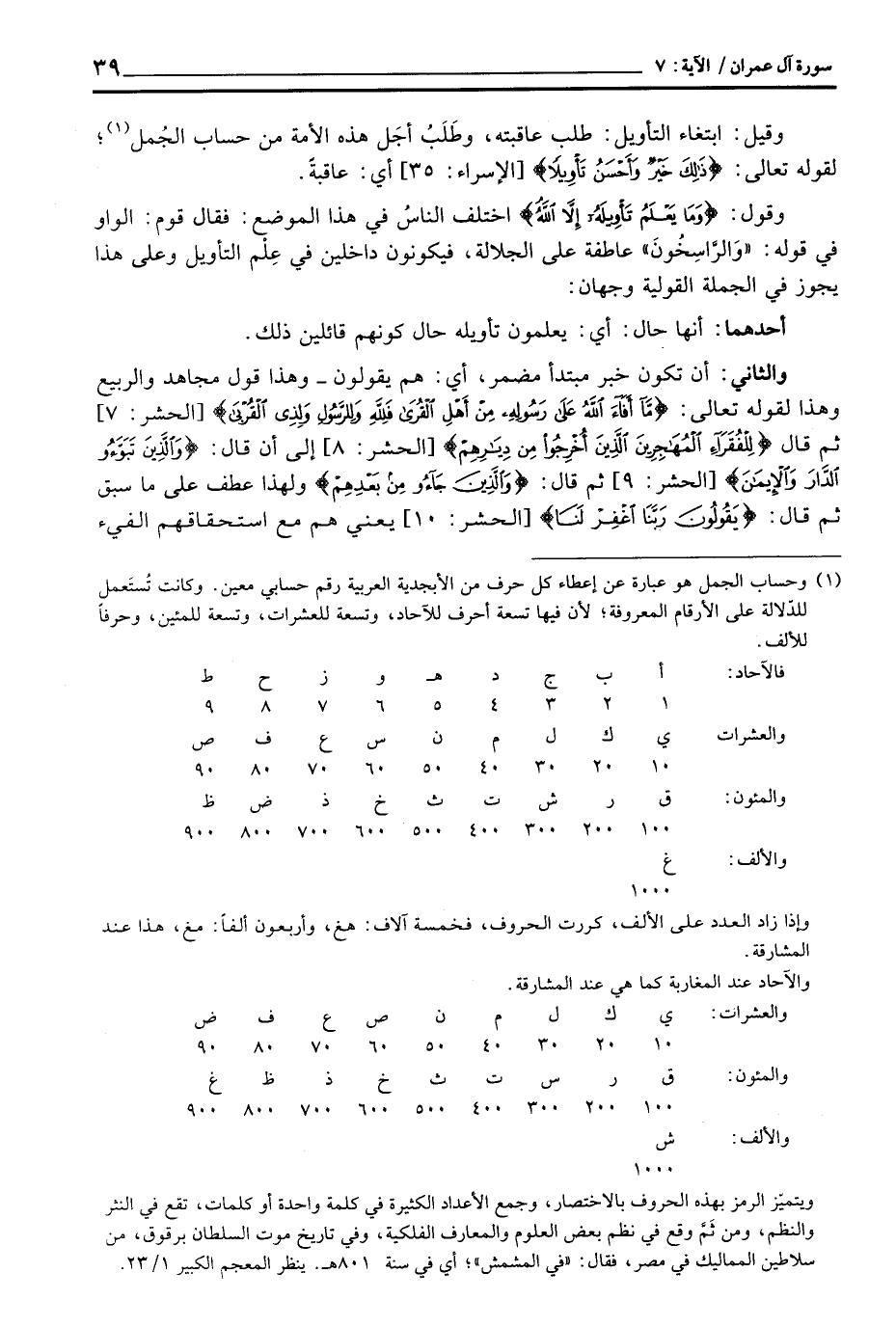 وقيل: ابتغاء التأويل: طلب عاقبته، وطَلَبُ أجَل هذه الأمة من حساب الجُمل؛ لقوله تعالى: {ذلك خَيْرٌ وَأَحْسَنُ تَأْوِيلاً} [الإسراء: 35] أي: عاقبةً.