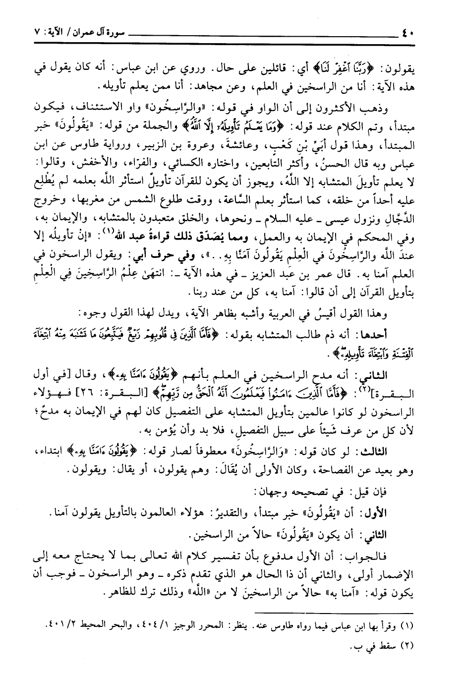 وذهب الأكثرون إلى أن الواو في وقله: «والرَّاسِخُونَ» واو الاستئناف، فيكون مستدأ، وتم الكلام عند قوله: {وَمَا يَعْلَمُ تَأْوِيلَهُ إِلاَّ الله} والجملة من قوله: «يَقُولُونَ» خبر المبتدأ، وهذا قول أبَيِّ بْنِ كَعْبٍ، وعائشةَ، وعروة بن الزبير، ورواية طاوس عن ابن عباس وبه قال الحسنُ، وأكثر التابعين، واختاره الكسائي، والفرّاء، والأخفش، وقالوا: لا يعلم تأويلَ المتشابه إلا اللهُ، ويجوز أن يكون للقرآن تأويلٌ استأثر الله بعلمه لم يُطْلِع عليه أحداً من خلقه، كما استأثر بعلم السَّاعة، ووقت طلوع الشمس من مغربها، وخروج الدَّجَّالِ ونزول عيسى - عليه السلام - ونحوها، والخلق متعبدون بالمتشابه، والإيمان به، وفي المحكم في الإيمان به والعمل، ومما يُصَدّق ذلك قراءةُ عبد الله: «إنْ تأويلُه إلا عندَ الله والرَّاسِخُونَ في الْعِلْمِ يَقُولُونَ آمَنَّا بِهِ. .» ، وفي حرف أبي: ويقول الراسخون في العلم آمنا به. قال عمر بن عبد العزيز - في هذه الآية -: انتهَى عِلْمُ الرَّاسِخِينَ فِي الْعِلْمِ بتأويل القرآن إلى أن قالوا: آمنا به، كل من عند ربنا.
