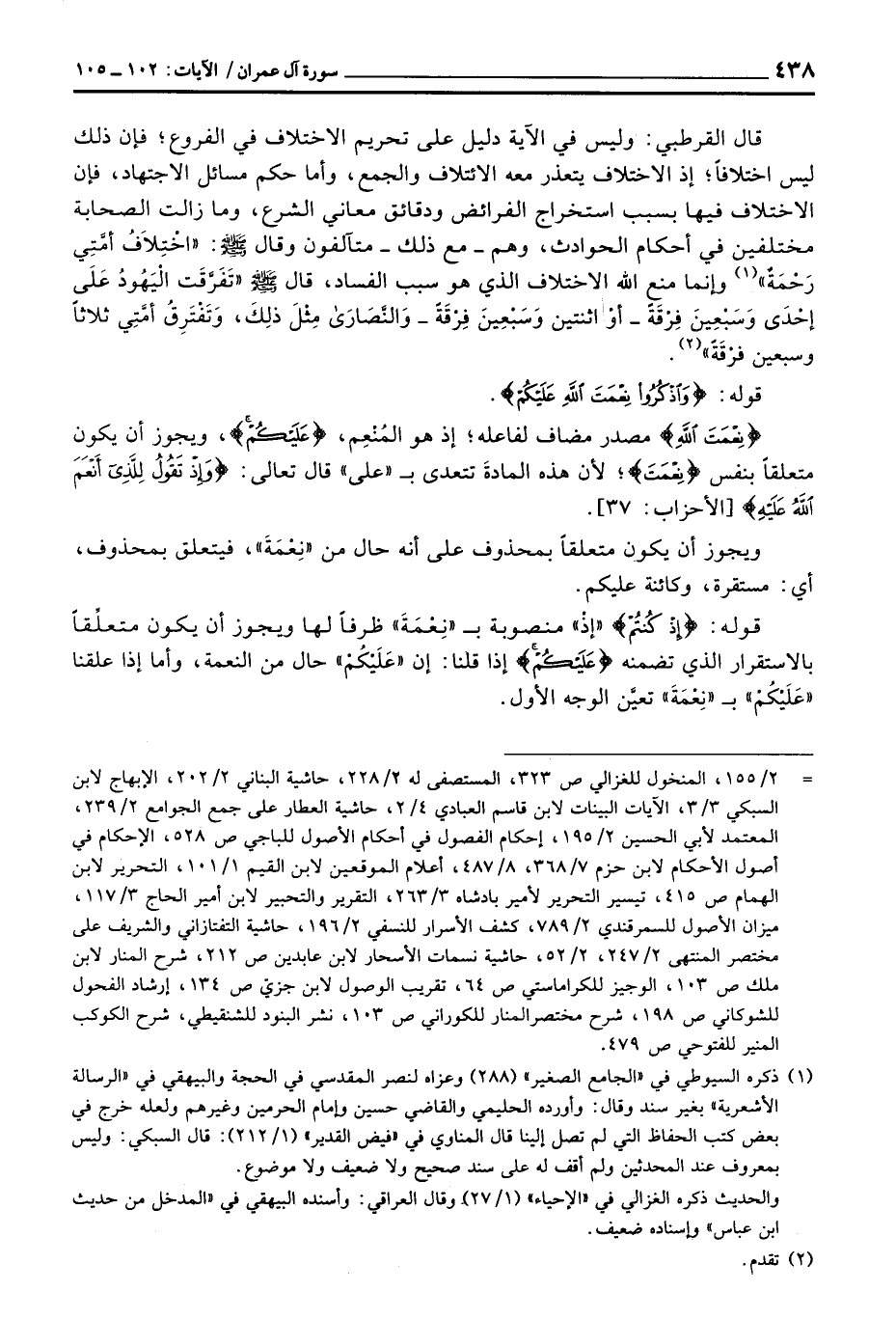 وإنما منع الله الاختلاف الذي هو سبب الفساد، قال صَلَّى اللَّهُ عَلَيْهِ وَسَلَّم َ: «تَفَرَّقَت اليَهُودُ عَلَى إحْدَى وَسَبْعِينَ فِرْقَةً - أوْ اثنتين وَسَبْعِينَ فِرْقَةً - وَالنَّصَارَى مِثْلَ ذَلِكَ، وَتَفْتَرِقُ أمَّتِي ثلاثاً وسبعين فرْقَةً» .