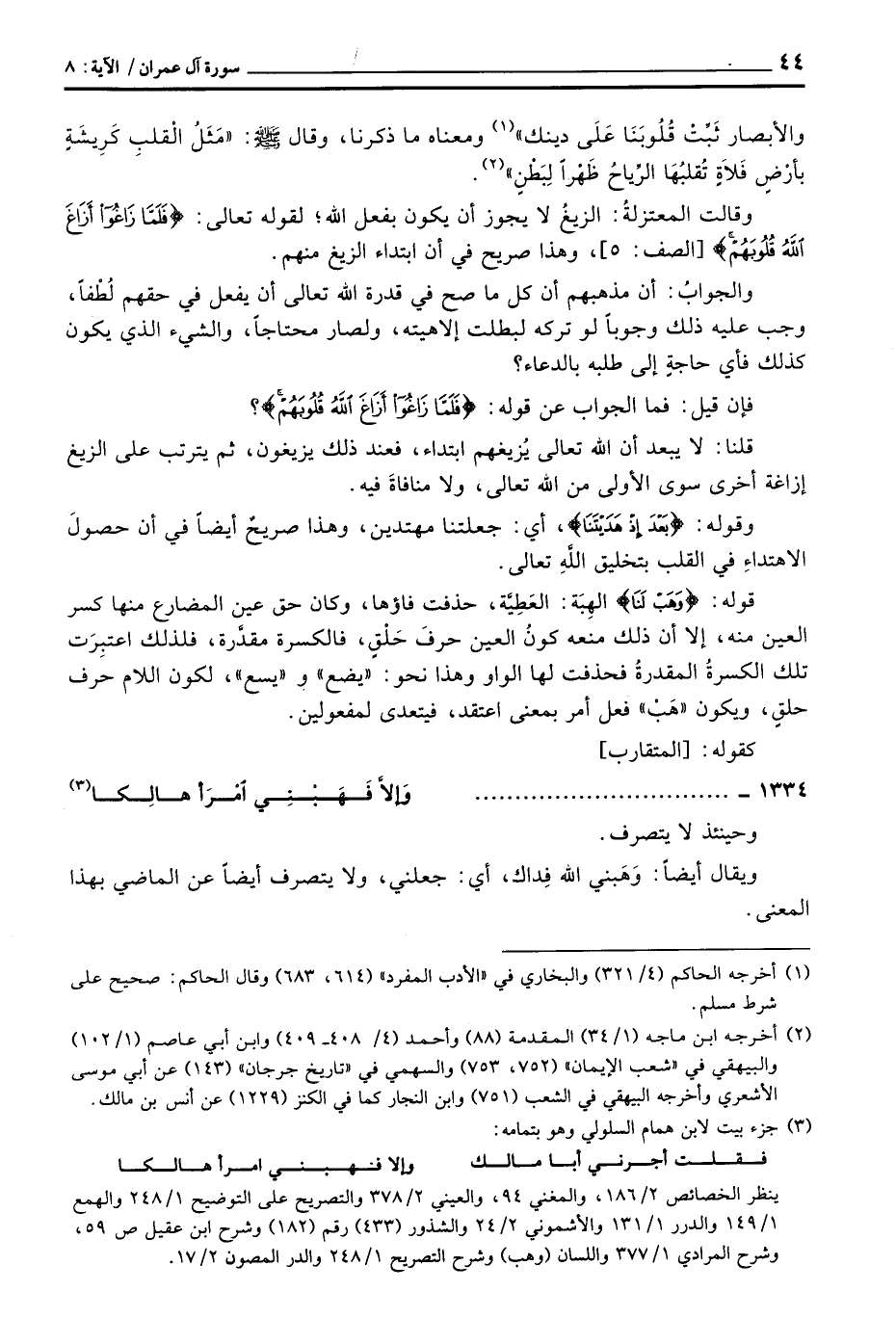 وقوله: {بَعْدَ إِذْ هَدَيْتَنَا} ، أي: جعلتنا مهتدين، وهذا صريحٌ أيضاً في أن حصولَ الاهتداءِ في القلب بتخليق اللهِ تعالى.