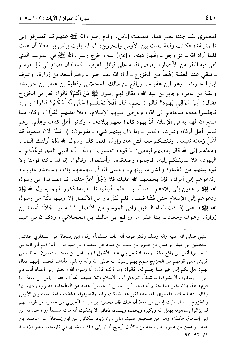 فلعمري لقد جئنا لغير هذا، فصمت إياس، وقام رسول الله صَلَّى اللَّهُ عَلَيْهِ وَسَلَّم َ عنهم ثم انصرفوا إلى «المدينة» ، فكانت وقعة بعاث بين الأوس والخزرج، ثم لم يلبث إياس بن معاذ أن هلك فلما أراد الله - عَزَّ وَجَلَّ - إظْهارَ دينهِ، وإعزازَ نبيه، خرج رسول الله صَلَّى اللَّهُ عَلَيْهِ وَسَلَّم َ في الموسم الذي لقي فيه النفر من الأنصار، يعرض نفسه على قبائل العرب - كما كان يصنع في كل موسم - فلقي عند العقبة رَهْطاً من الخزرج - أراد الله بهم خيراً - وهم أسعد بن زرارة، وعوف ابن الحارث - وهو ابن عفراء - ورافع بن مالك العجلاني وقطبة بن عامر بن خريدة، وعقبة بن عامر، وجابر بن عبد الله، فقال لهم رسول الله صَلَّى اللَّهُ عَلَيْهِ وَسَلَّم َ «مَنْ أنْتُمْ؟ قالوا: نفر من الخزرج فقال: أمِنْ مَوَالِي يَهُود؟ قالوا: نعم، قال أفَلاَ تَجْلُسوا حَتَّى أكلِّمَكُمْ» ؟ قالوا: بلى، فجلسوا معه، فدعاهم إلى الله، وعرض عليهم الإسلام، وتلا عليهم القرآن، وكان مما صنع الله لهم به في الإسلام أنّ يهود كانوا معهم ببلادهم، وكانوا أهل كتاب وعِلْم، وهم كانوا أهل أوثان وشِرْك، وكانوا - إذا كان بينهم شيء - يقولون: إن نبيًّا الآن مبعوثاً قد أظَلَّ زمانه نتبعه، ونقتلكم معه قتل عاد وإرمَ، فلما كلم رسول الله صَلَّى اللَّهُ عَلَيْهِ وَسَلَّم َ أولئك النفر، ودعاهم إلى الله قال بعضهم لبعض: يا قوم، تعلمون - والله - أنه النبي الذي توعَّدَكم به اليهود، فلا تسبقنكم إليه، فأجابوه وصدقوه، وأسلموا، وقالوا: إنا قد تركنا قومنا ولا قوم بينهم من العَدَاوةِ والشر ما بينهم، وعسى الله أن يجمعهم بك، وسنقدم عليهم، وندعوهم إلى أمرك، فإن يجمعهم الله عليك فلا رَجُلَ أعزُّ منك، ثم انصرفوا عن رسول الله صَلَّى اللَّهُ عَلَيْهِ وَسَلَّم َ راجعين إلى بلادهم - قد آمنوا - فلما قَدِمُوا «المدينة» ذكروا لهم رسول الله صَلَّى اللَّهُ عَلَيْهِ وَسَلَّم َ ودعوهم إلى الإسلام حتى فَشَا فيهم، فلم تَبْقَ دار من الأنصار إلا وفيها ذِكْرٌ من رسول الله صَلَّى اللَّهُ عَلَيْهِ وَسَلَّم َ، حتى إذا كان العام المقبل وافَى الموسم من الأنصار اثنا عشر رَجُلاً: أسعد بن زرارة، وعوف ومعاذ - ابنا عفراء، ورافع بن مالك بن العجلاني، وذكوان بن عبد