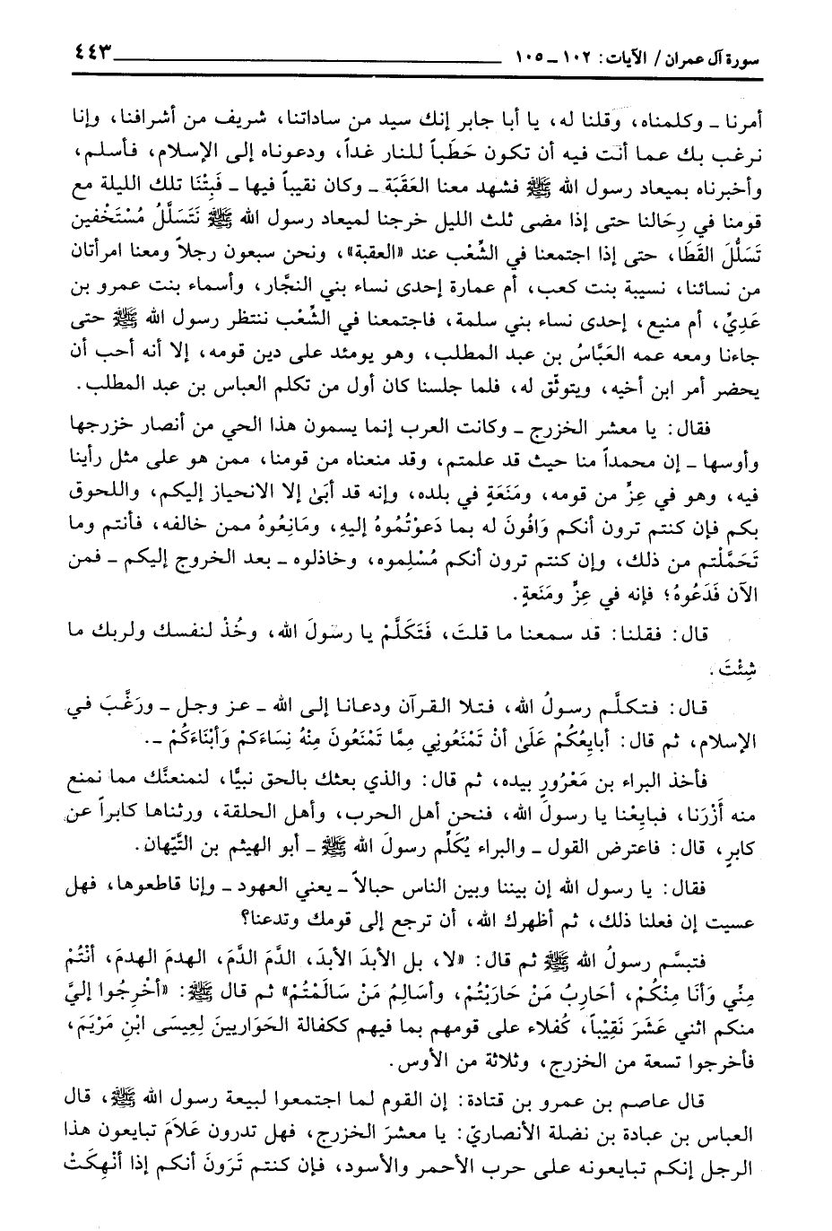 أمرنا - وكلمناه، وقلنا له، يا أبا جابر إنك سيد من ساداتنا، شريف من أشرافنا، وإنا نرغب بك عما أنت فيه أن تكون حَطَباً للنار غداً، ودعوناه إلى الإسلام، فأسلم، وأخبرناه بميعاد رسول الله صَلَّى اللَّهُ عَلَيْهِ وَسَلَّم َ فشهد معنا العَقَبَة - وكان نقيباً فيها - فَبِتْنَا تلك الليلة مع قومنا في رِحَالنا حتى إذا مضى ثلث الليل خرجنا لميعاد رسول الله صَلَّى اللَّهُ عَلَيْهِ وَسَلَّم َ نَتَسَلَّلُ مُسْتَخْفِين تَسَلُّلَ القَطَا، حتى إذا اجتمعنا في الشِّعْب عند «العقبة» ، ونحن سبعون رجلاً ومعنا امرأتان من نسائنا، نسيبة بنت كعب، أم عمارة إحدى نساء بني النجَّار، وأسماء بنت عمرو بن عَدِيِّ، أم منيع، إحدى نساء بني سلمة، فاجتمعنا في الشِّعْب ننتظر رسول الله صَلَّى اللَّهُ عَلَيْهِ وَسَلَّم َ حتى جاءنا ومعه عمه العَبَّاسُ بن عبد المطلب، وهو يومئذ على دين قومه، إلا أنه أحب أن يحضر أمر ابن أخيه، ويتوثّق له، فلما جلسنا كان أول من تكلم العباس بن عبد المطلب.