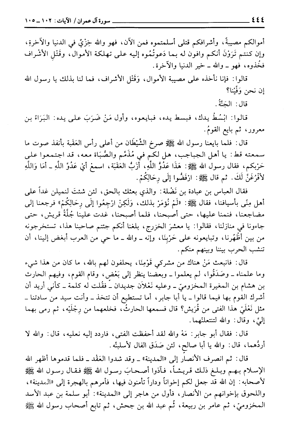 فقال العباس بن عبادة بن نَضْلة: والذي بعثك بالحق، لئن شئتَ لنميلن غداً على أهل مِنًى بأسيافنا، فقال صَلَّى اللَّهُ عَلَيْهِ وَسَلَّم َ: «لَمْ نُؤْمَرْ بذلك، وَلِكِنْ ارْجِعُوا إلَى رِحَالِكُمْ» فرجعنا إلى مضاجعنا، فنمنا عليها، حتى أصبحنا، فلما أصبحنا، غدت علينا جُلَّةُ قريش، حتى جاءونا في منازلنا، فقالوا: يا معشرَ الخزرج، بلغنا أنكم جئتم صاحبنا هذا، تستخرجونه من بين أظْهُرنا، وتبايعونه على حَرْبِنَا، وإنه - والله - ما حي من العرب أبغض إلينا، أن تنشب الحرب بيننا وبينهم منكم.