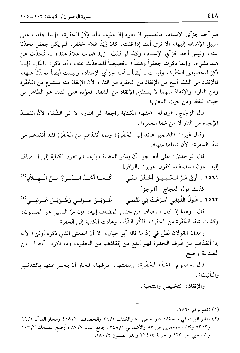 قال: وهذا إذا كان المضاف من جنس المضاف إليه، فإن مَرَّ السنين هو المسنون، وكذلك شفا الحُفْرة من الحفرة، فذكَّر الشَّفَا، وعادت الكناية إلى الحفرة.