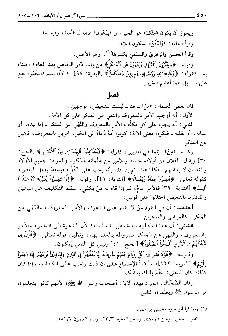 وكلمة: «مِنْ» : إنما هي للتبيين، كقوله: {فاجتنبوا الرجس مِنَ الأوثان} [الحج: 30] ويقال: لفلان من أولاده جند، وللأمير من غِلْمانه عَسْكَر، والمراد: جميع الأولاد والغلمان لا بعضهم - فكذا هنا. ثم إذا قلنا بأنه يجب على الكُلِّ، فيسقط بفعل البعض، كقوله تعالى: {انفروا خِفَافاً وَثِقَالاً} [التوبة: 41] ، وقوله: {إِلاَّ تَنفِرُواْ يُعَذِّبْكُمْ عَذَاباً أَلِيماً} [التوبة: 39] فالأمر عامٌّ، ثم إذا قام به مَنْ يكفي، سقط التكليف عن الباقين والقائلون بالتبعيض اختلفوا على قولين: