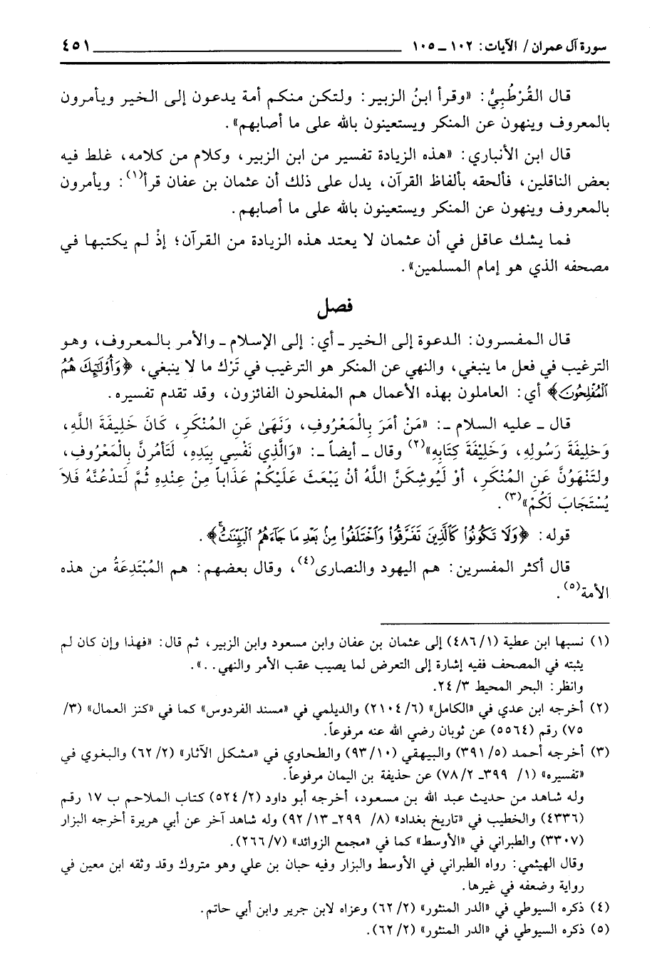 قال ابن الأنباري: «هذه الزيادة تفسير من ابن الزبير، وكلام من كلامه، غلط فيه بعض الناقلين، فألحقه بألفاظ القرآن، يدل على ذلك أن عثمان بن عفان قرأ: ويأمرون بالمعروف وينهون عن المنكر ويستعينون بالله على ما أصابهم.