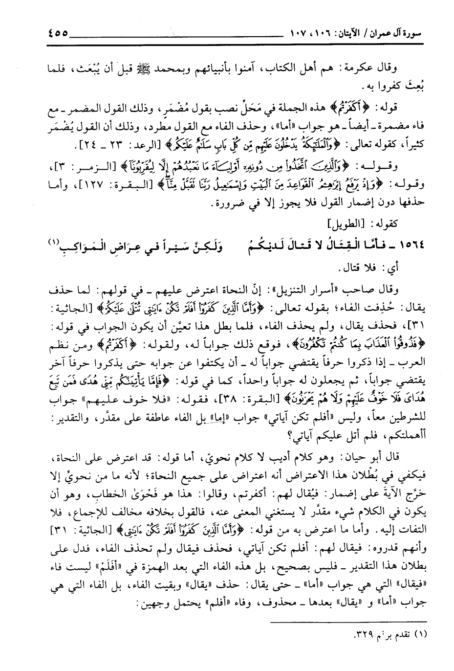 وأما ما اعترض به من قوله: {وَأَمَّا الذين كفروا أَفَلَمْ تَكُنْ آيَاتِي} [الجاثية: 31] وأنهم قدروه: فيقال لهم: أفلم تكن آياتي، فحذف فيقال ولم تحذف الفاء، فدل على بطلان هذا التقدير - فليس بصحيح، بل هذه الفاء التي بعد الهمزة في «أفَلَمْ» ليست فاء «فيقال» التي هي جواب «أما» - حتى يقال: حذف «يقال» وبقيت الفاء، بل الفاء التي هي جواب «أما» و «يقال» بعدها - محذوف، وفاء «أفلم» يحتمل وجهين: