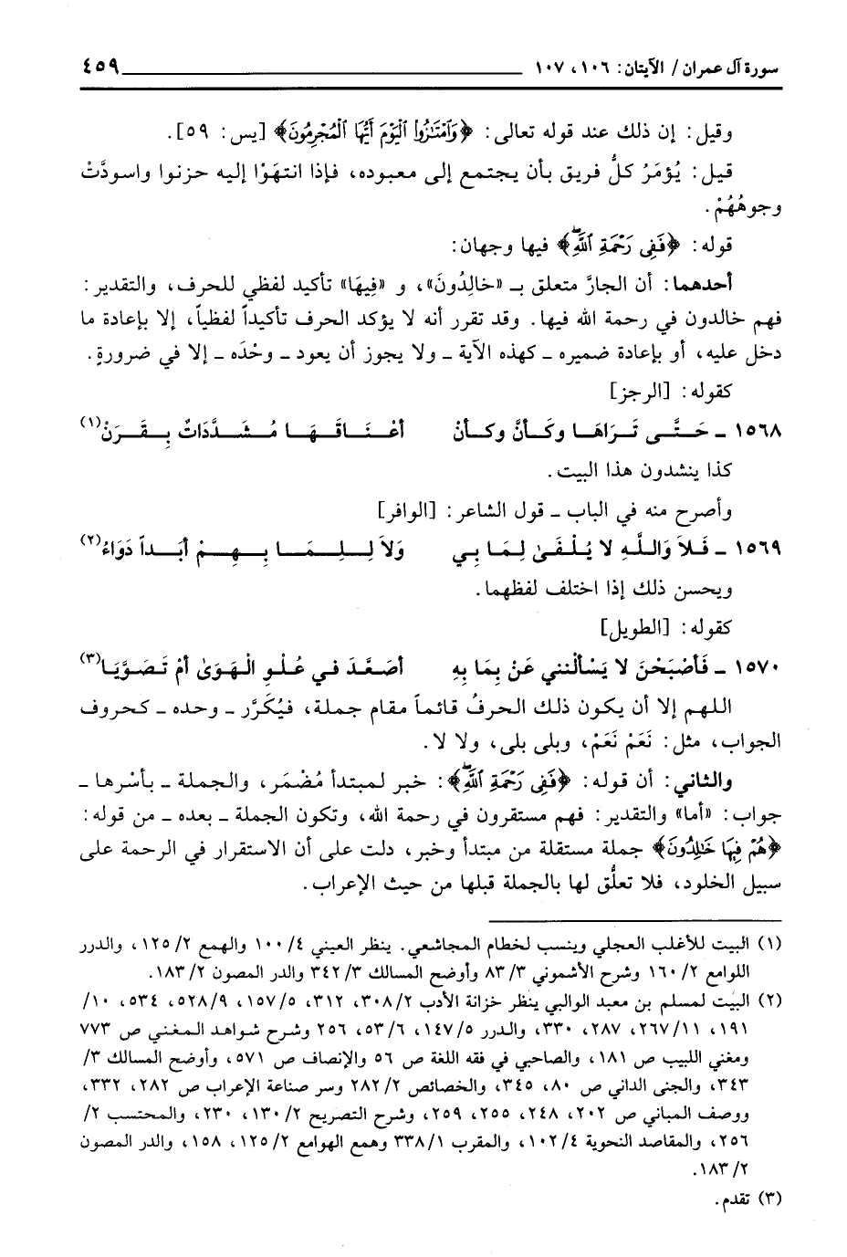 أحدهما: أن الجارَّ متعلق ب «خالِدُونَ» ، و «فِيهَا» تأكيد لفظي للحرف، والتقدير: فهم خالدون في رحمة الله فيها. وقد تقرر أنه لا يؤكد الحرف تأكيداً لفظياً، إلا بإعادة ما دخل عليه، أو بإعادة ضميره - كهذه الآية - ولا يجوز أن يعود - وحْدَه - إلا في ضرورةٍ.