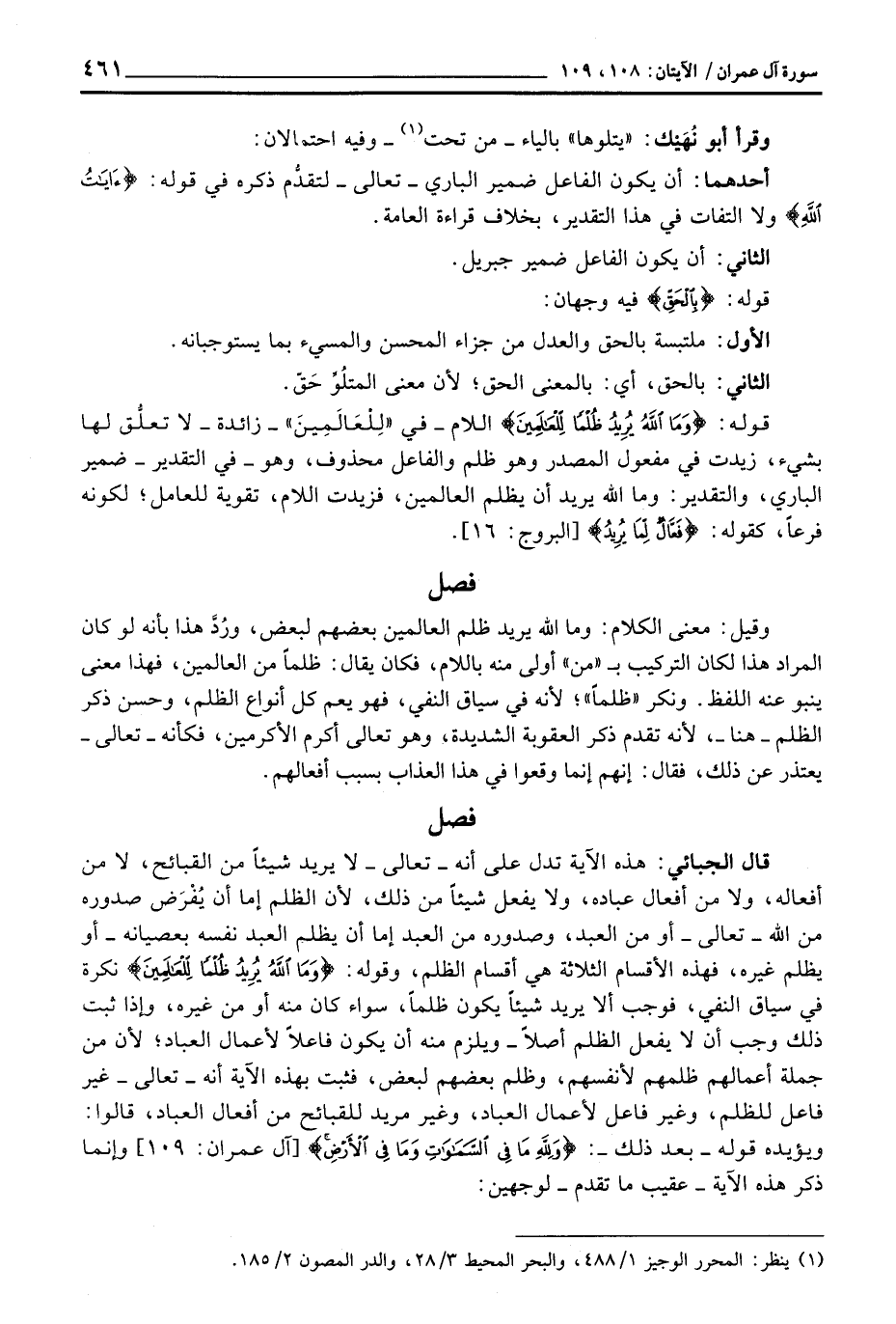 قال الجبائي: هذه الآية تدل على أنه - تعالى - لا يريد شيئاً من القبائح، لا من أفعاله، ولا من أفعال عباده ولا يفعل شيئاً من ذلك، لأن الظلم إما أن يُفْرَض صدوره من الله - تعالى - أو من العبد، وصدوره من العبد إما أن يظلم العبد نفسه بعصيانه - أو يظلم غيره، فهذه الأقسام الثلاثة هي أقسام الظلم، وقوله: {وَمَا الله يُرِيدُ ظُلْماً لِّلْعَالَمِينَ} نكرة في سياق النفي، فوجب ألا يريد شيئاً يكون ظلماً، سواء كان منه أو من غيره، وإذا ثبت ذلك وجب أن لا يفعل الظلم أصلاً - ويلزم منه أن يكون فاعلاً لأعمال العباد؛ لأن من جملة أعمالهم ظلمهم لأنفسهم، وظلم بعضهم لبعض، فثبت بهذه الآية أنه - تعالى - غير فاعل للظلم، وغير فاعل لأعمال العباد، وغير مريد للقبائح من أفعال العباد، قالوا: ويؤيده قوله - بعد ذلك -: {وَللَّهِ مَا فِي السماوات وَمَا فِي الأرض} [آل عمران: 109] وإنما ذكر هذه الآية - عقيب ما تقدم - لوجهين: