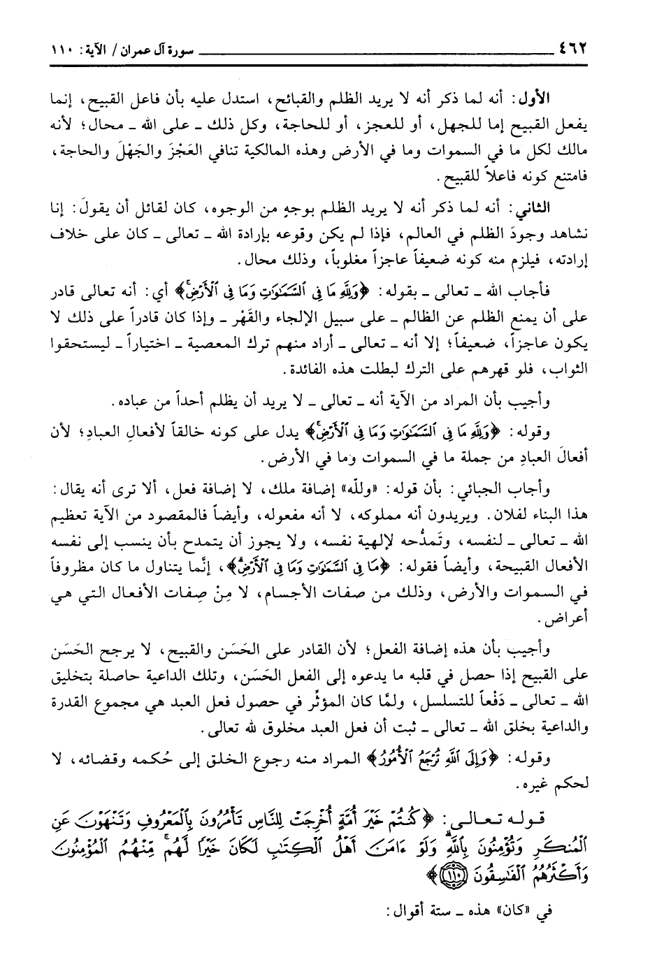 وأجاب الجبائي: بأن قوله: «ولله» إضافة ملك، لا إضافة فعل، ألا ترى أنه يقال: هذا البناء لفلان. ويريدون أنه مملوكه، لا أنه مفعوله، وأيضاً فالمقصود من الآية تعظيم الله - تعالى - لنفسه، وتَمدُّحه لإلهية نفسه، ولا يجوز أن يتمدح بأن ينسب غلى نفسه الأفعال القبيحة، وأيضاً فقوله: {مَا فِي السماوات وَمَا فِي الأرض} ، إنما يتناول ما كان مظروفاً في السموات والأرض، وذلك من صفات الأجسام، لا مِنْ صفات الأفعال التي هي أعراض.