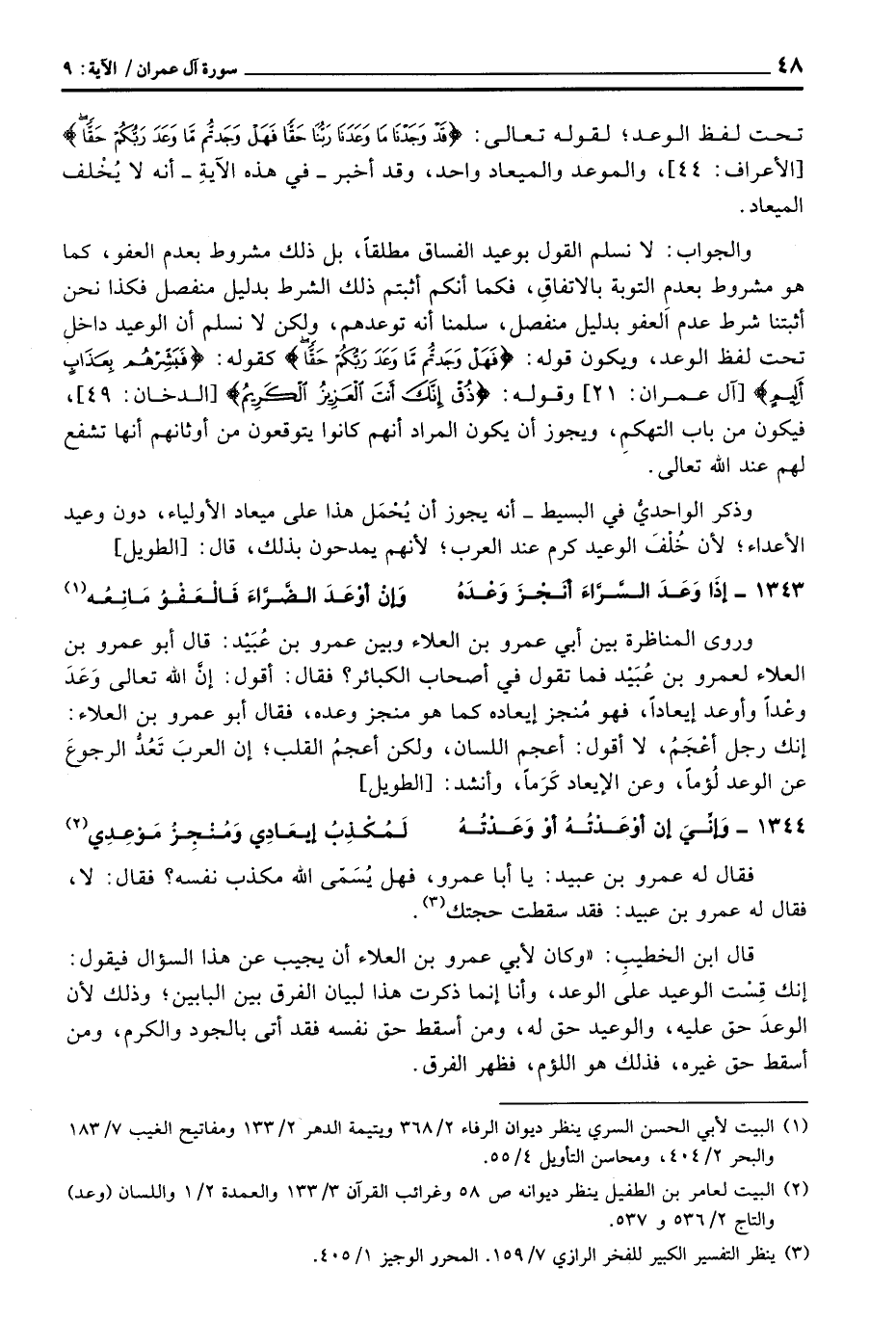 وروى المناظرة بين أبي عمرو بن العلاء وبين عمرو بن عُبَيْد: قال أبو عمرو بن العلاء لعمرو بن عُبَيْد فما تقول في أصحاب الكبائر؟ فقال: أقول: إنَّ الله تعالى وَعَدَ وعْداً وأوعد إيعاداً، فهو مُنجز إيعاده كما هو منجز وعده، فقال أبو عمرو بن العلاء: إنك رجل أعْجَمُ، لا أقول: أعجم اللسان، ولكن أعجمُ القلب؛ إن العربَ تَعُدُّ الرجوعَ عن الوعد لُؤماً، وعن الإيعاد كَرَمًا، وأنشد: [الطويل]