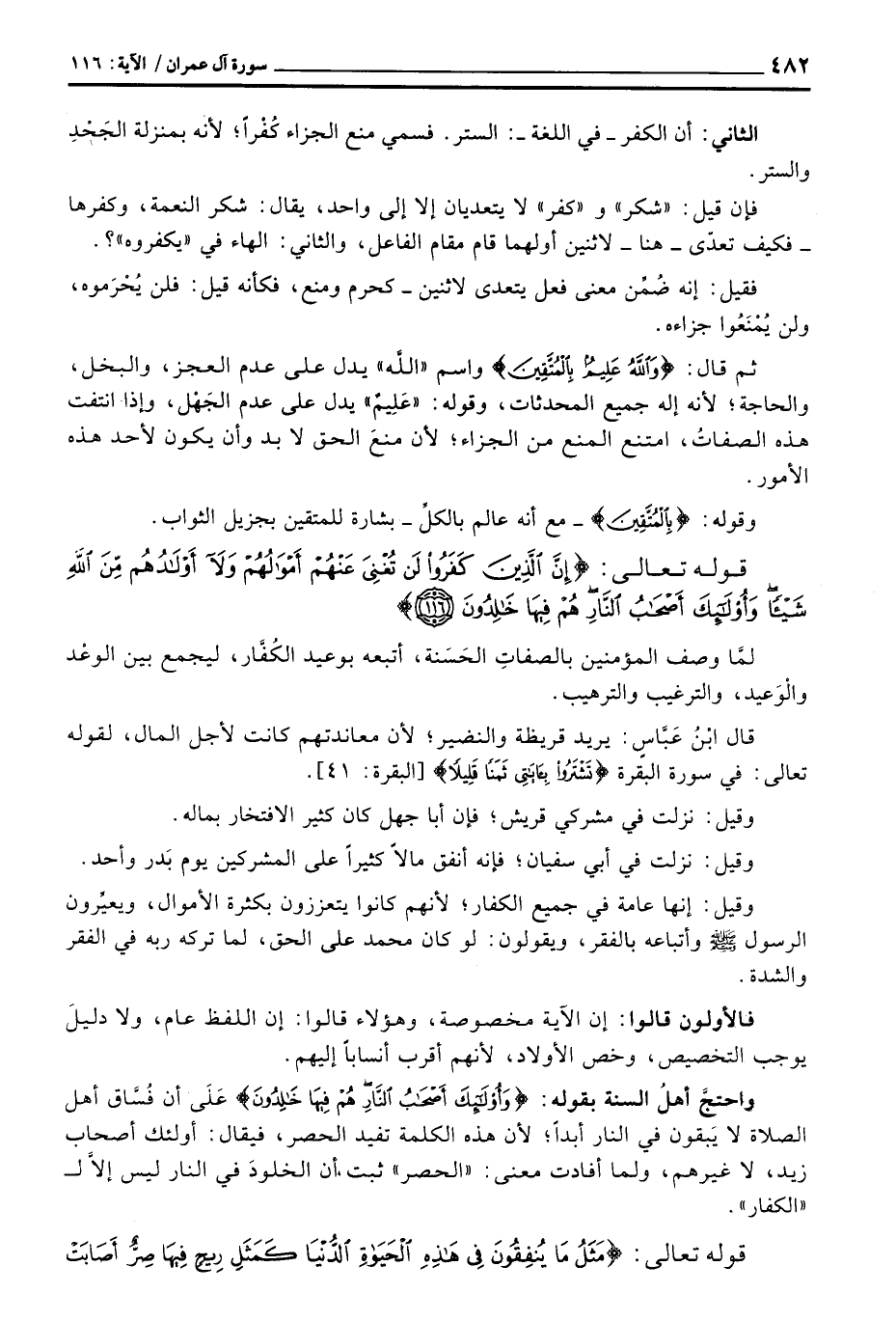 واحتجَّ أهلُ السنة بقوله: {وأولئك أَصْحَابُ النار هُمْ فِيهَا خَالِدُونَ} عَلَى أن فُسَّاق أهل الصلاة لا يَبقون في النار أبداً؛ لأن هذه الكلمة تفيد الحصر، فيقال: أولئك أصحاب زيد، لا غيرهم، ولما أفادت معنى: «الحصر» ثبت أن الخلودَ في النار ليس إلاَّ ل «الكفار» .