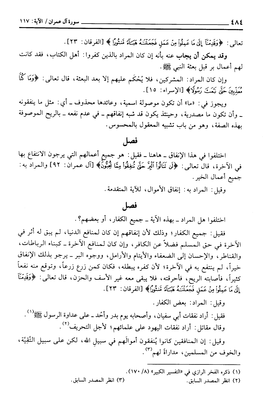 فقيل: جميع الكفار؛ وذلك لأن إنفاقهم إن كان لمنافع الدنيا، لم يبق له أثر في الآخرة في حق المسلم فضلاً عن الكافر، وإن كان لمنافع الآخرة - كبناء الرباطات، والقناطر، والإحسان إلى الضعفاء والأيتام والأرامل، ووجوه البر - يرجو بذلك الإنفاق خيراً، لم ينتفع به في الآخرة؛ لأن كفره يبطله، فكان كمن زرع زرعاً، وتوقع منه تقطعاً كثيراً، فأصابته الريح، فأحرقته، فلا يبقى معه غير الأسف والحزن، قال تعالى: {وَقَدِمْنَآ إلى مَا عَمِلُواْ مِنْ عَمَلٍ فَجَعَلْنَاهُ هَبَآءً مَّنثُوراً} [الفرقان: 23] .