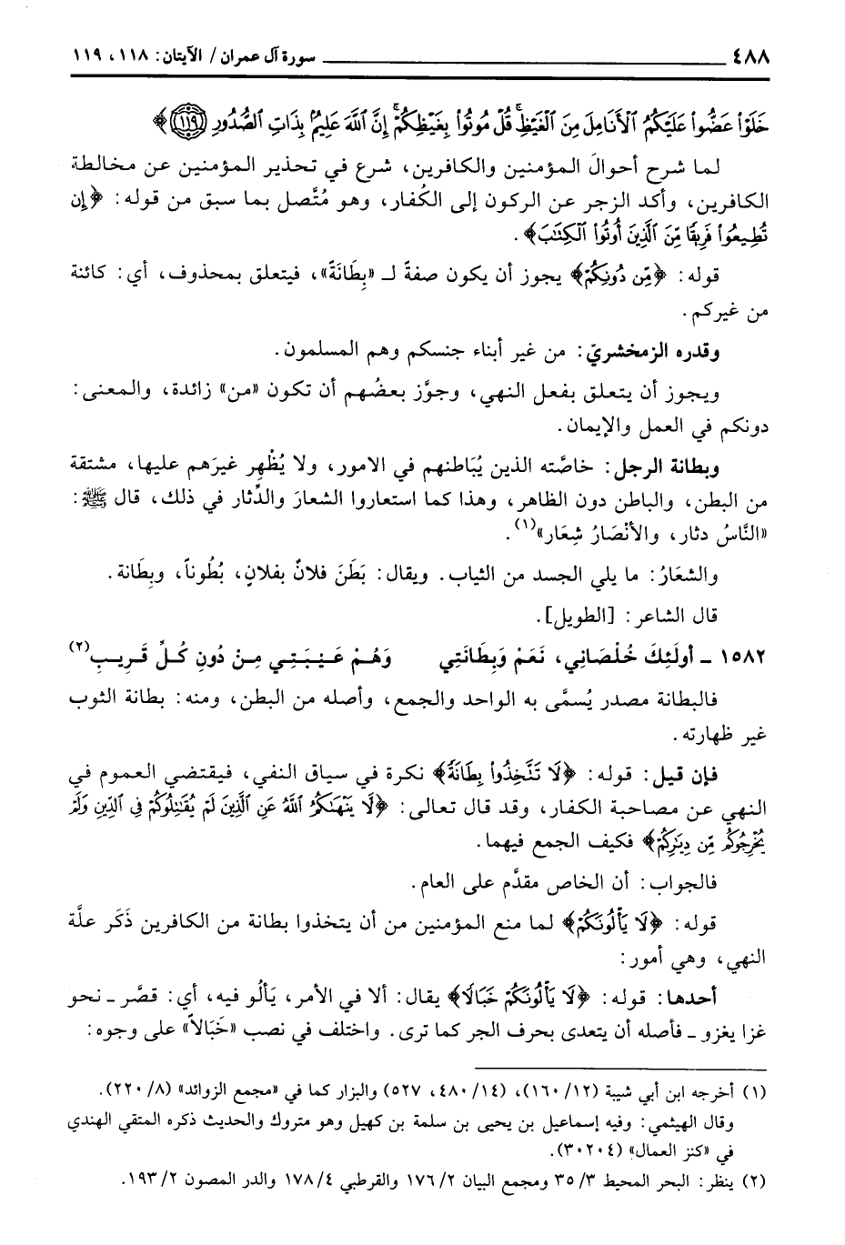 وبطانة الرجل: خاصَّته الذين يُبَاطنهم في الأمور، ولا يُظْهِر غيرَهم عليها، مشتقة من البطن، والباطن دون الظاهر، وهذا كما استعاروا الشعارَ والدِّثار في ذلك، قال صَلَّى اللَّهُ عَلَيْهِ وَسَلَّم َ: «النَّاسُ دثار، والأنْصَارُ شِعَار» .