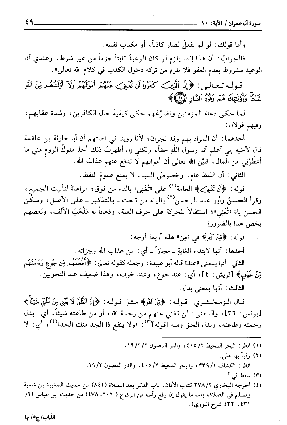قال الزمخشري: قوله: {مِّنَ الله} مثل قوله: {إَنَّ الظن لاَ يُغْنِي مِنَ الحق شَيْئاً} [يونس: 36] ، والمعنى: لن تغني عنهم من رحمة الله، أو من طاعته شيئاً، أي: بدل رحمته وطاعته، وبدل الحق ومنه [قوله] : «ولا ينفع ذا الجد منك الجد» ، أي: لا