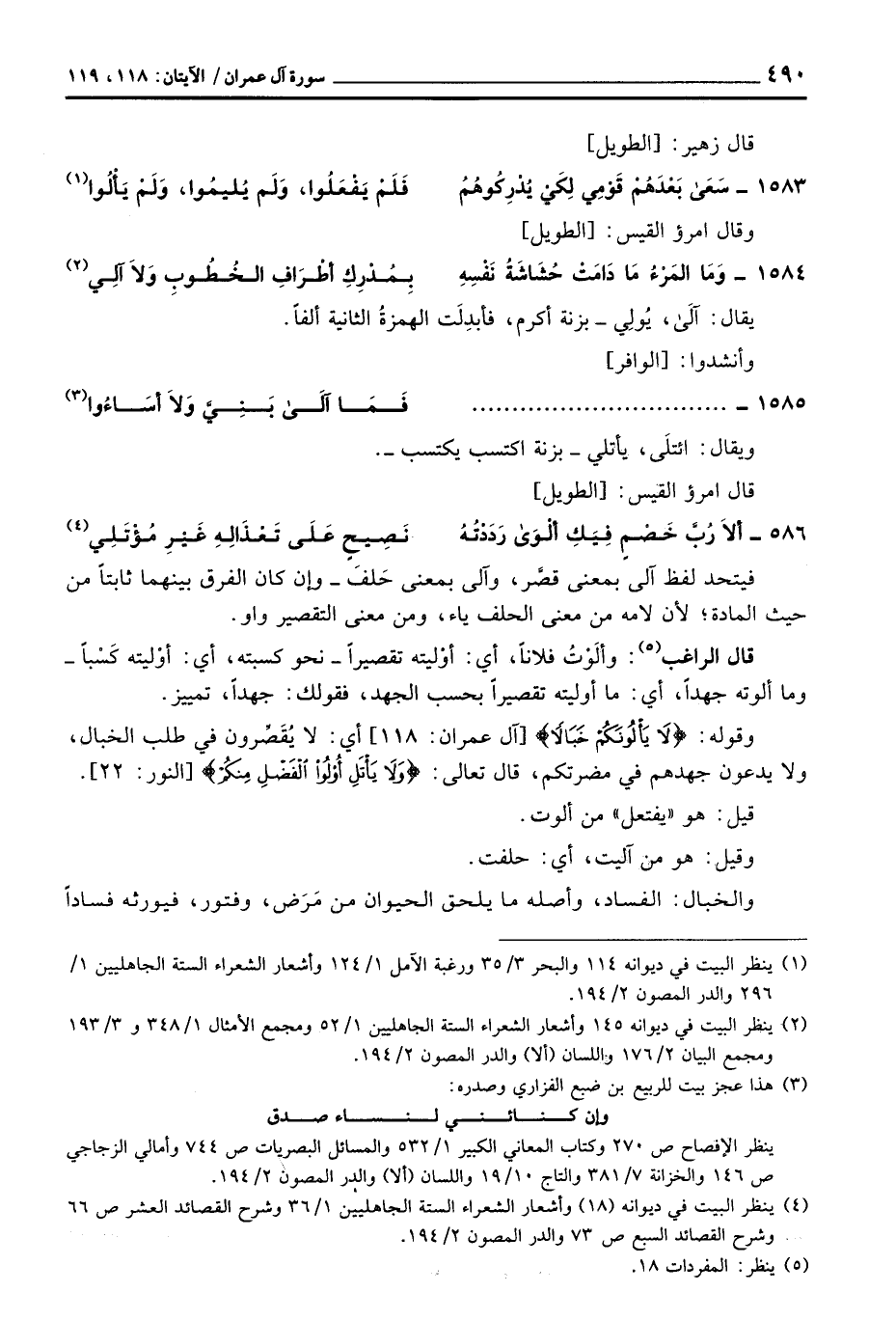وقوله: {لاَ يَأْلُونَكُمْ خَبَالاً} [آل عمران: 118] أي: لا يُقَصِّرون في طلب الخبال، ولا يدعون جهدهم في مضرتكم، قال تعالى: {وَلاَ يَأْتَلِ أُوْلُواْ الفضل مِنكُمْ} [النور: 22] .