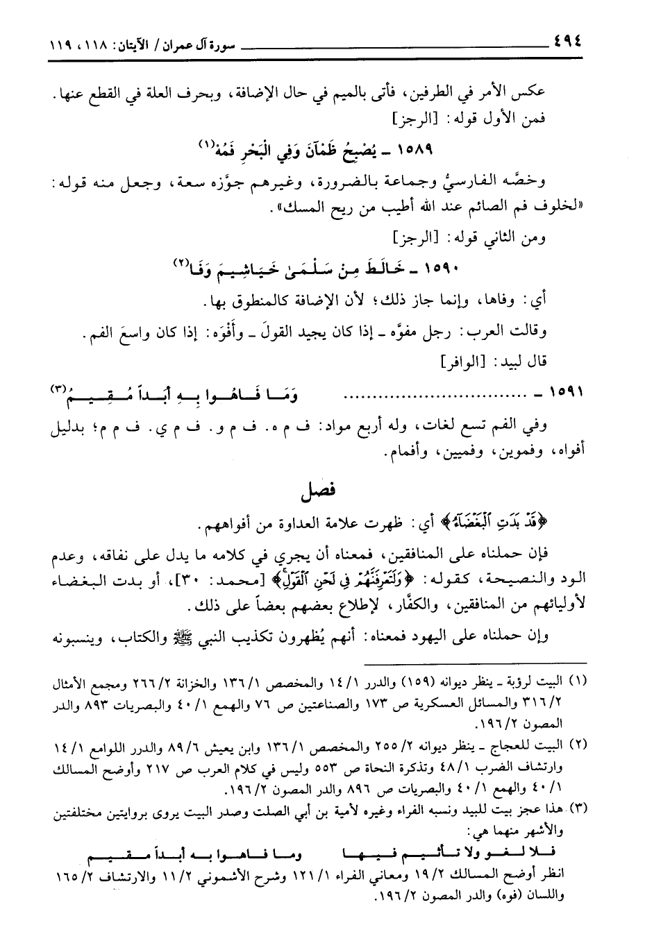 1589 - يُصْبِحُ ظَمْآنَ وَفِي الْبَحْرِ فَمُهُ ... وخصَّه الفارسيُّ وجماعة بالضرورة، وغيرهم جوَّزه سعة، وجعل منه قوله: «لخلوف فم الصائم عند الله أطيب من ريح المسك» .