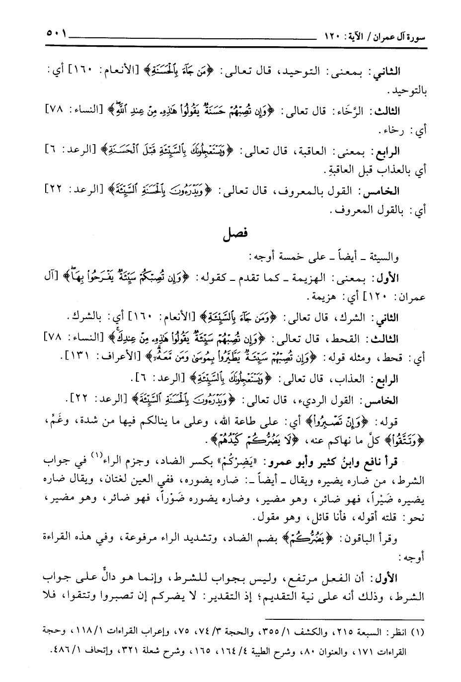 قرأ نافع وابنُ كثير وأبو عمرو: «يَضُرْكُمْ» بكسر الضاد، وجزم الراء في جواب الشرط، من ضاره يضيره ويقال - أيضاً -: ضاره يضوره، ففي العين لغتان، ويقال ضاره يضيره ضَيْراً، فهو ضائر، وهو مضير، نحو: قلته أقوله، فأنا قائل، وهو مقول.