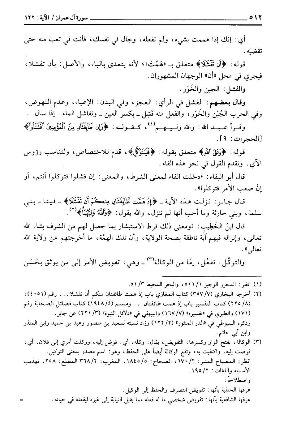 قال جابر: نزلت هذه الآية - {إِذْ هَمَّتْ طَّآئِفَتَانِ مِنكُمْ أَن تَفْشَلاَ} - فينا - بني سلمة، وبني حارثة وما أحب أنها لم تنزل، والله يقول: {والله وَلِيُّهُمَا} .