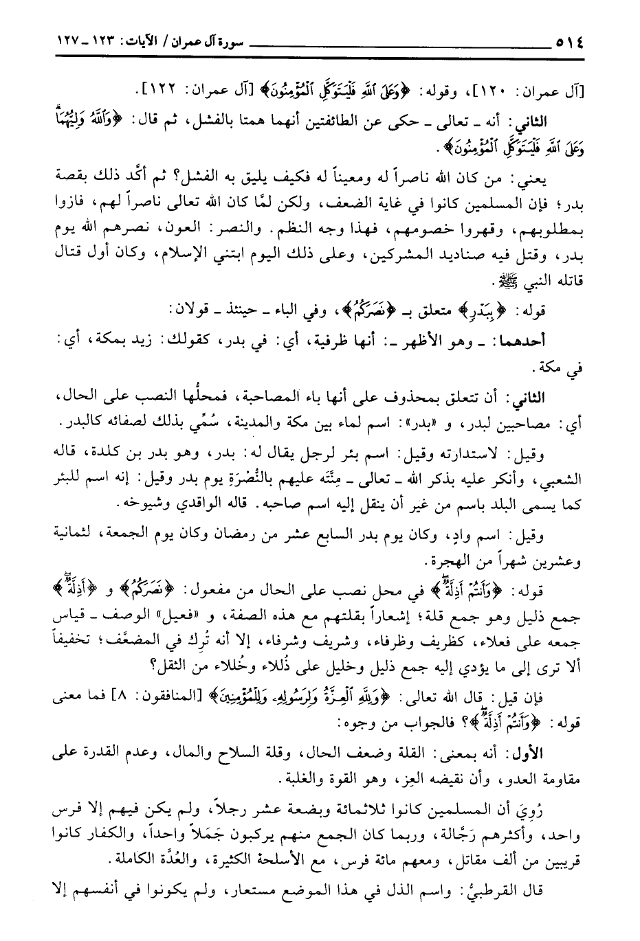 ثعني: من كان الله ناصراً له ومعيناً له فكيف يليق به الفشل؟ ثم أكَّد ذلك بقصة بدر؛ فإن المسلمين كانوا في غاية الضعف، ولكن لمَّا كان الله تعالى ناصراً لهم، فازوا بمطلوبهم، وقهروا خصومهم، فهذا وجه النظم. والنصر: العون، نصرهم الله يوم بدر، وقتل فيه صناديد المشركين، وعلى ذلك اليوم ابتني الإسلام، وكان أول قتال قاتله النبي صَلَّى اللَّهُ عَلَيْهِ وَسَلَّم َ.