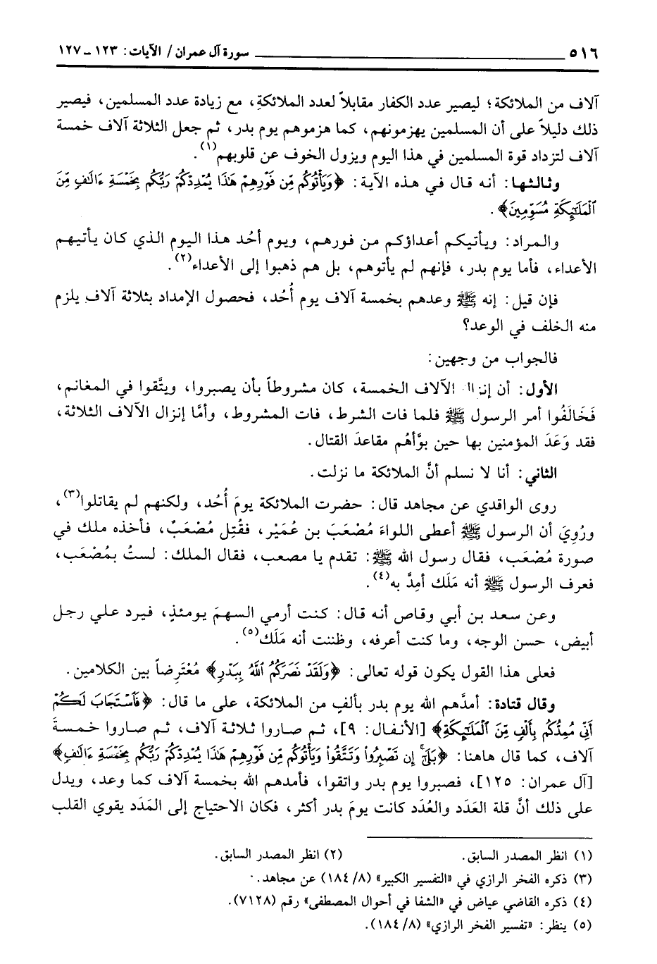 وقال قتادة: أمدَّهم الله يوم بدر بألفٍ من الملائكة، على ما قال: {فاستجاب لَكُمْ أَنِّي مُمِدُّكُمْ بِأَلْفٍ مِّنَ الملاائكة} [الأنفال: 9] ، ثم صاروا ثلاثة آلاف، ثم صاروا خمسةَ آلاف، كما قال هاهنا: {بلى إِن تَصْبِرُواْ وَتَتَّقُواْ وَيَأْتُوكُمْ مِّن فَوْرِهِمْ هذا يُمْدِدْكُمْ رَبُّكُمْ بِخَمْسَةِ آلااف} [آل عمران: 125] ، فصبروا يوم بدر واتقوا، فأمدم الله بخمسة آلاف كما وعد، ويدل على ذلك أنَّ قلة العَدَد والعُدَد كانت يومَ بدر أكثر، فكان الاحتياج إلى المَدَد يقوي القلب -
