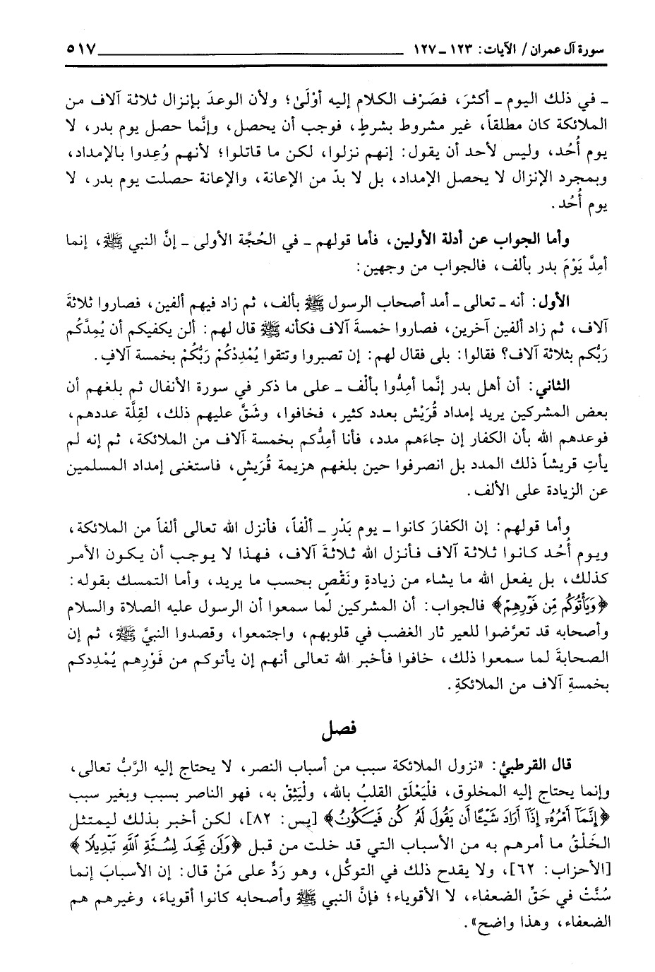 وأما قولهم: إن الكفارَ كانوا - يوم بَدْرٍ - ألْفاً، فأنزل الله تعالى ألفاً من الملائكة، ويوم أُحُد كانوا ثلاثة آلاف فأنزل الله ثلاثةَ آلاف، فهذا لا يوجب أن يكون الأمر كذلك، بل يفعل الله ما يشاء من زيادةٍ ونَقْصٍ بحسب ما يريد، وأما التمسك بقوله: {وَيَأْتُوكُمْ مِّن فَوْرِهِمْ} فالجواب: أن المشركين لمّا سمعوا أن الرسول عَلَيْهِ الصَّلَاة وَالسَّلَام ُ وأصحابه قد تعرَّضوا للعير ثار الغضب في قلوبهم، واجتمعوا، وقصدوا النبيَّ صَلَّى اللَّهُ عَلَيْهِ وَسَلَّم َ، ثم إن الصحابةَ لما سمعوا ذلك، خافوا فأخبر الله تعالى أنهم إن يأتوكم من فَوْرِهم يُمْدِدكم بخمسةِ آلاف من الملائكة.