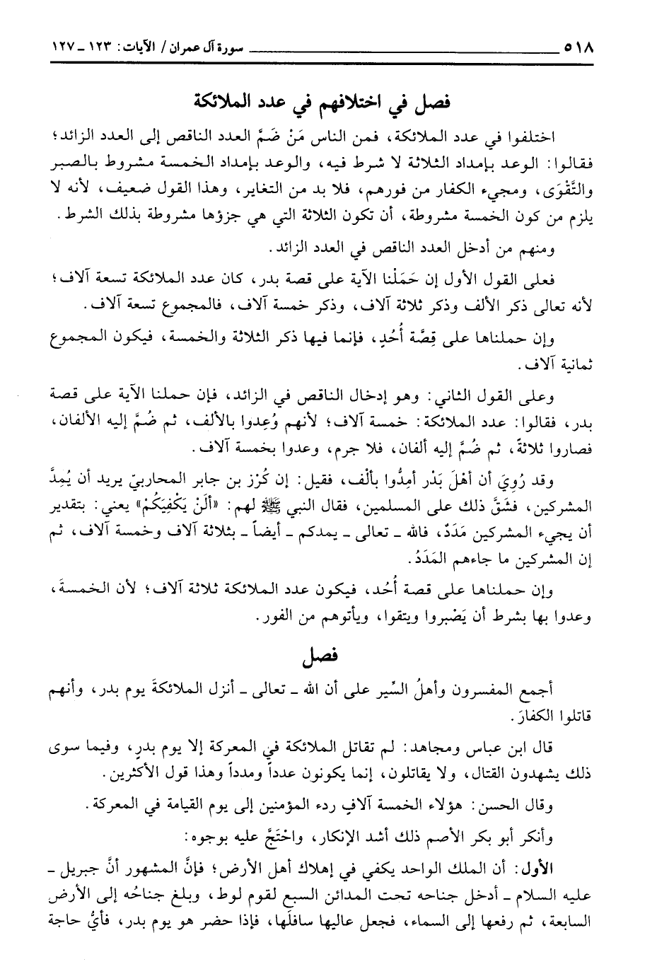 اختلفوا في عدد الملائكة، فمن الناس مَنْ ضَمَّ العدد الناقص إلى العدد الزائد؛ فقالوا: الوعد بإمداد الثلاثة لا شرط فيه، والوعد بإمداد الخمسة مشروط بالصبر والتَّقْوَى، ومجيء الكفار من فورهم، فلا بد من التغاير، وهذا القول ضعيف، لأنه لا يلزم من كون الخمسة مشروطة، أن تكون الثلاثة التي هي جزؤها مشروطة بذلك الشرط.