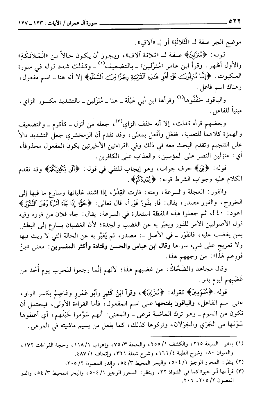 قوله: {مُنْزَلِينَ} صفة ل «ثلاثة آلاف» ، ويجوز أن يكون حالاً من «الْمَلاَئِكَةِ» والأول أظهر. وقرأ ابن عامر «مُنزَّلين» - بالتضعيف - وكذلك شدد قوله في سورة العنكبوت: {إِنَّا مُنزِلُونَ على أَهْلِ هذه القرية رِجْزاً مِّنَ السمآء} [العنكبوت: 34] إلا أنه هنا - اسم مفعول، وهناك اسم فاعل.