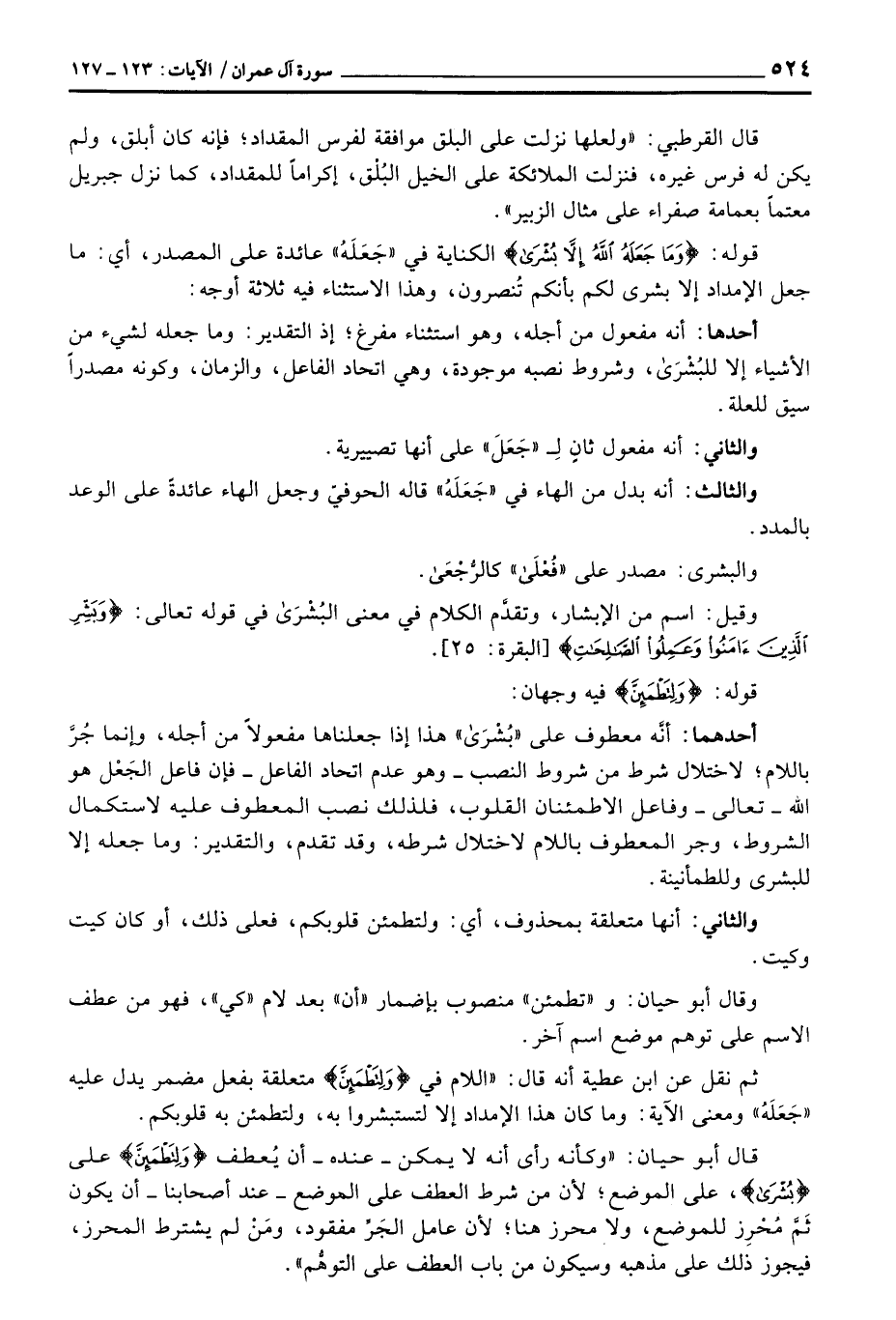 ثم نقل عن ابن عطية أنه قال: «اللام في {وَلِتَطْمَئِنَّ} متعلقة بفعل مضمر يدل عليه» جَعَلَهُ «ومعنى الآية: وما كان هذا الإمداد إلا لتستبشروا به، ولتطمئن به قلوبكم.
