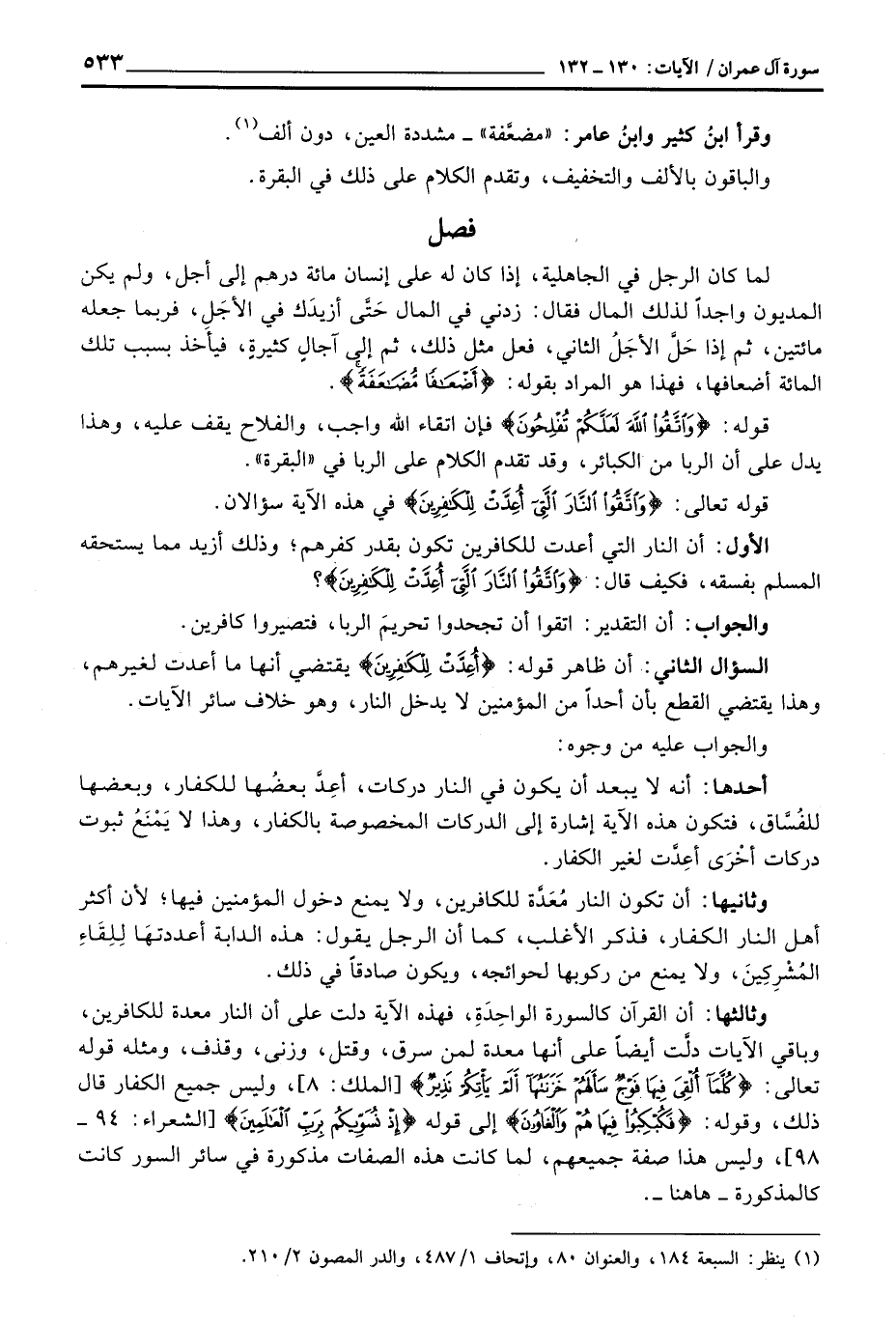 والجواب: أن التقدير: اتقوا أن تجحدوا تحريمَ الربا، فتصيروا كافرين.