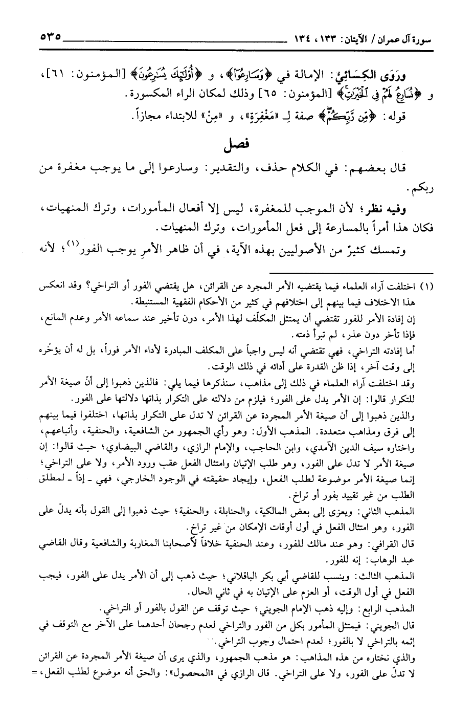 وتمسك كثيرٌ من الأصوليين بهذه الآية، في أن ظاهر الأمرِ يوجب الفور؛ لأنه