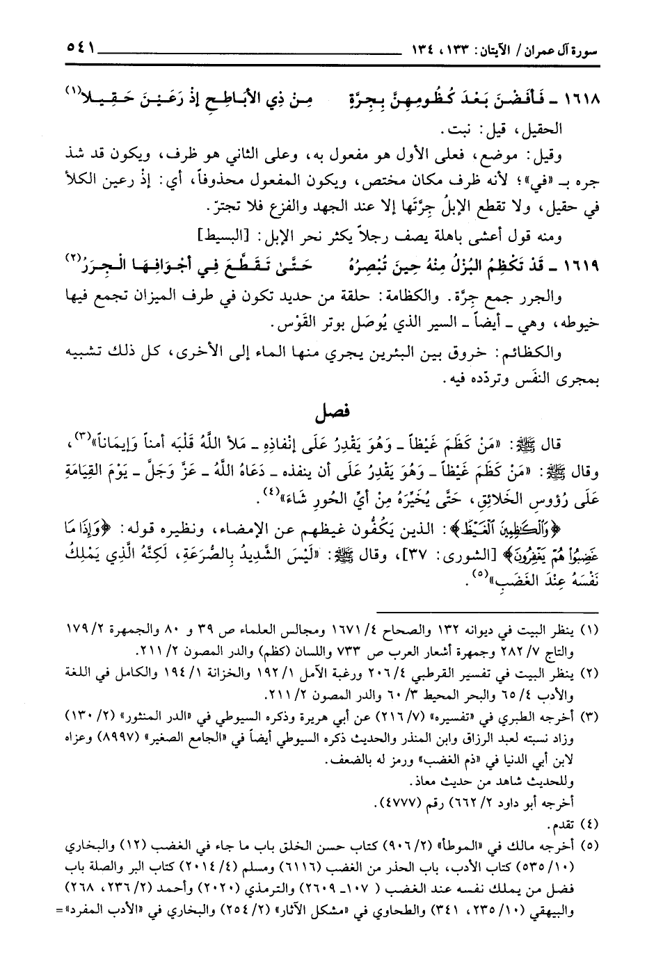 {والكاظمين الغيظ} : الذين يَكُفُّونَ عيظهم عن الإمضاء، ونظيره قوله: {وَإِذَا مَا غَضِبُواْ هُمْ يَغْفِرُونَ} [الشورى: 37] ، وقال صَلَّى اللَّهُ عَلَيْهِ وَسَلَّم َ: «لَيْسَ الشَّدِيدُ بِالصُّرَعَةِ، لَكِنَّهُ الَّذِي يَمْلِكُ نَفْسَهُ عِنْدَ الغَضَبِ» .