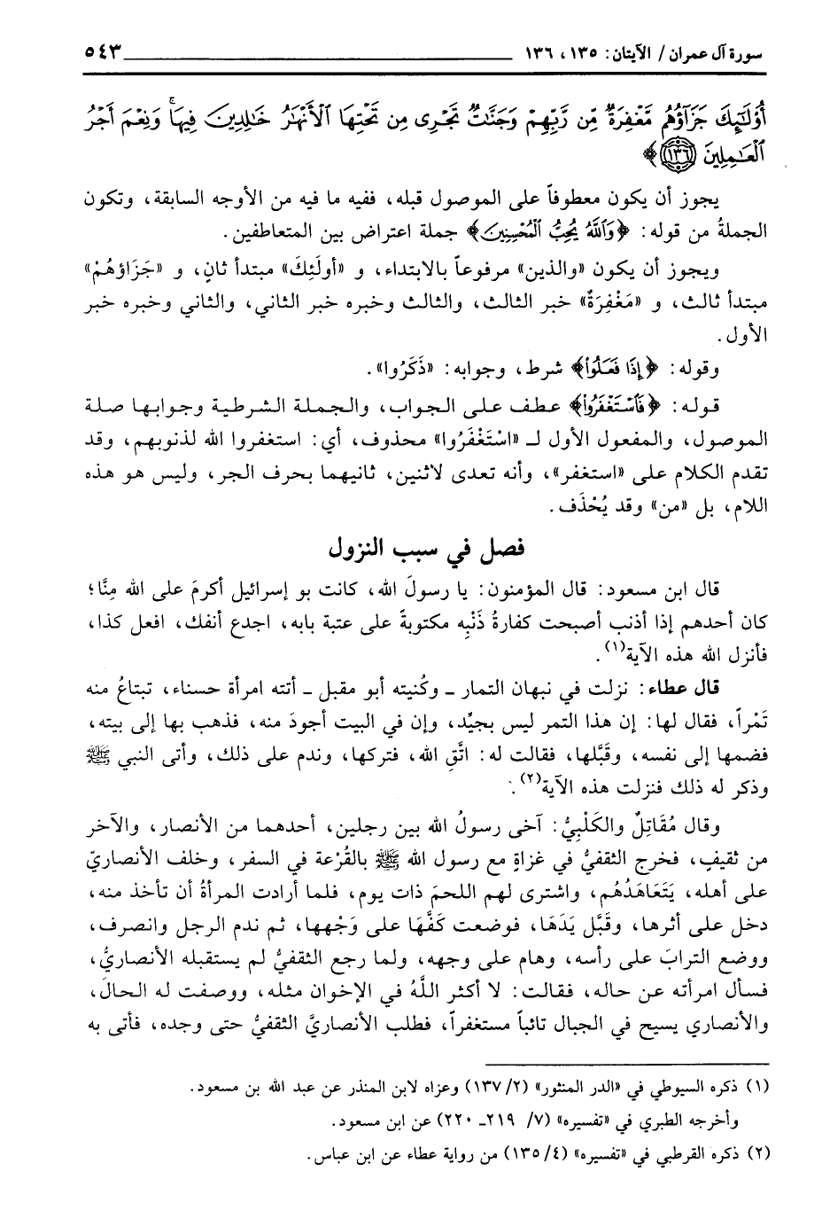 يجوز أن يكون معطوفاً على الموصول قبله، ففيه ما فيه من الأوجه السابقة، وتكون الجملةُ من قوله: {والله يُحِبُّ المحسنين} [آل عمران: 134] جملة اعتراض بين المتعاطفين.