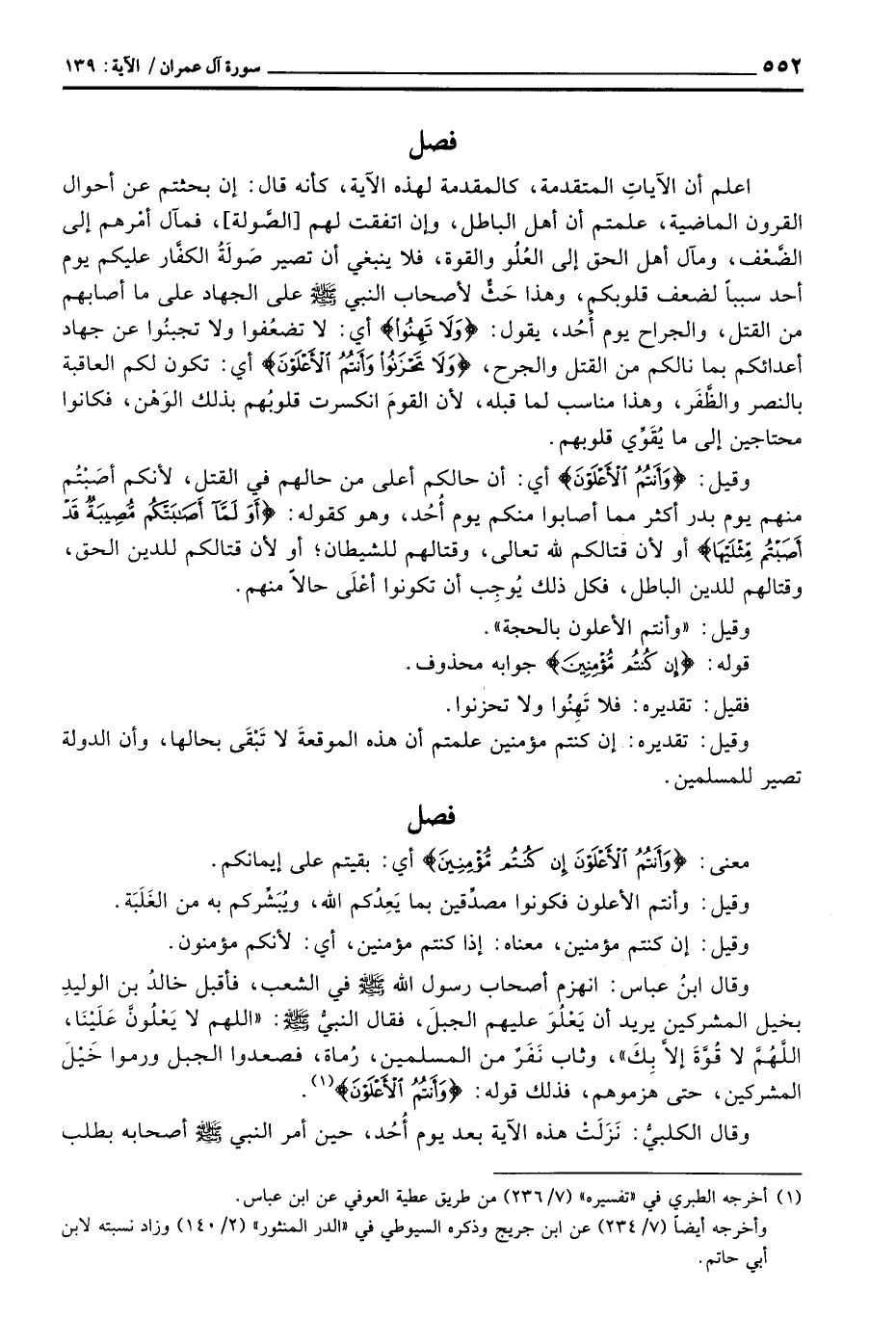 وقال ابنُ عباس: انهزم أصحاب رسول الله صَلَّى اللَّهُ عَلَيْهِ وَسَلَّم َ في الشعب، فأقبل خالدُ بن الوليد بخيل المشركين يريد أن يَعْلُوَ عليهم الجبلَ، فقال النبيُّ صَلَّى اللَّهُ عَلَيْهِ وَسَلَّم َ: «اللهم لا يَعْلُونَّ عَلَيْنَا، اللهُمَّ لا قُوَّةَ إلاَّ بِكَ» ، وثاب نَفَرٌ من المسلمين، رُماة، فصعدوا الجبل ورموا خَيْلَ المشركين، حتى هزموهم، فذلك قوله: {وَأَنْتُمُ الأَعْلَوْنَ} .