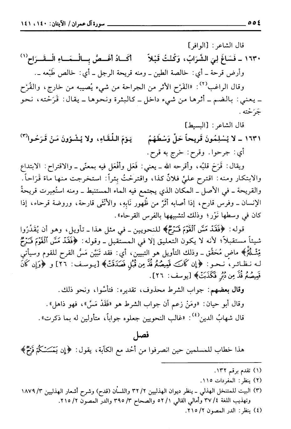 قوله: {فَقَدْ مَسَّ القوم قَرْحٌ} للنحويين - في مثل هذا - تأويل، وهو أن يُقَدِّرُوا شيئاً مستقبلاً؛ لأنه لا يكون التعليق إلا في المستقبل - وقوله: {فَقَدْ مَسَّ القوم قَرْحٌ مِثْلُهُ} ماضٍ مُحَقَّق - وذلك التأويل هو التبيين، أي: فقد تَبَيَّن مَسُّ القرح للقوم وسيأتي له نظائر، نحو: {إِن كَانَ قَمِيصُهُ قُدَّ مِن قُبُلٍ فَصَدَقَتْ} [يوسف: 26] و {وَإِنْ كَانَ قَمِيصُهُ قُدَّ مِن دُبُرٍ فَكَذَبَتْ} [يوسف: 27] .