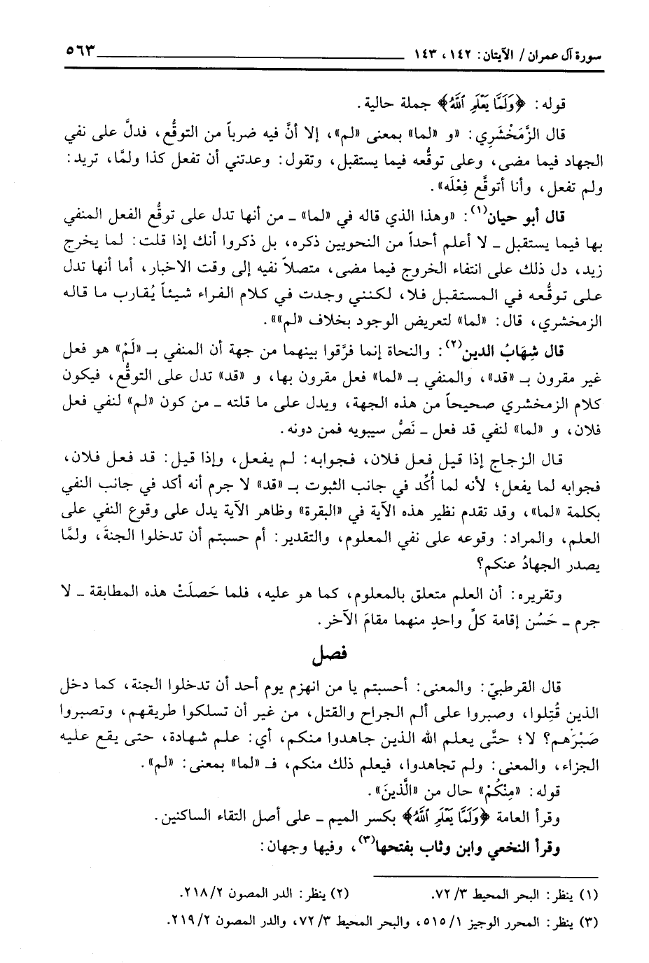قال شِهَابُ الدين: والنحاة إنما فرَّقوا بينهما من جهة أن المنفي ب «لَمْ» هو فعل غير مقرون ب «قد» ، والمنفي ب «لما» فعل مقرون بها، و «قد» تدل على التوقُّع، فيكون كلام الزمخشري صحيحاً من هذه الجهة، ويدل على ما قلته - من كون «لم» لنفي فعل فلان، و «لما» لنفي قد فعل - نصُّ سيبويه فمن دونه.