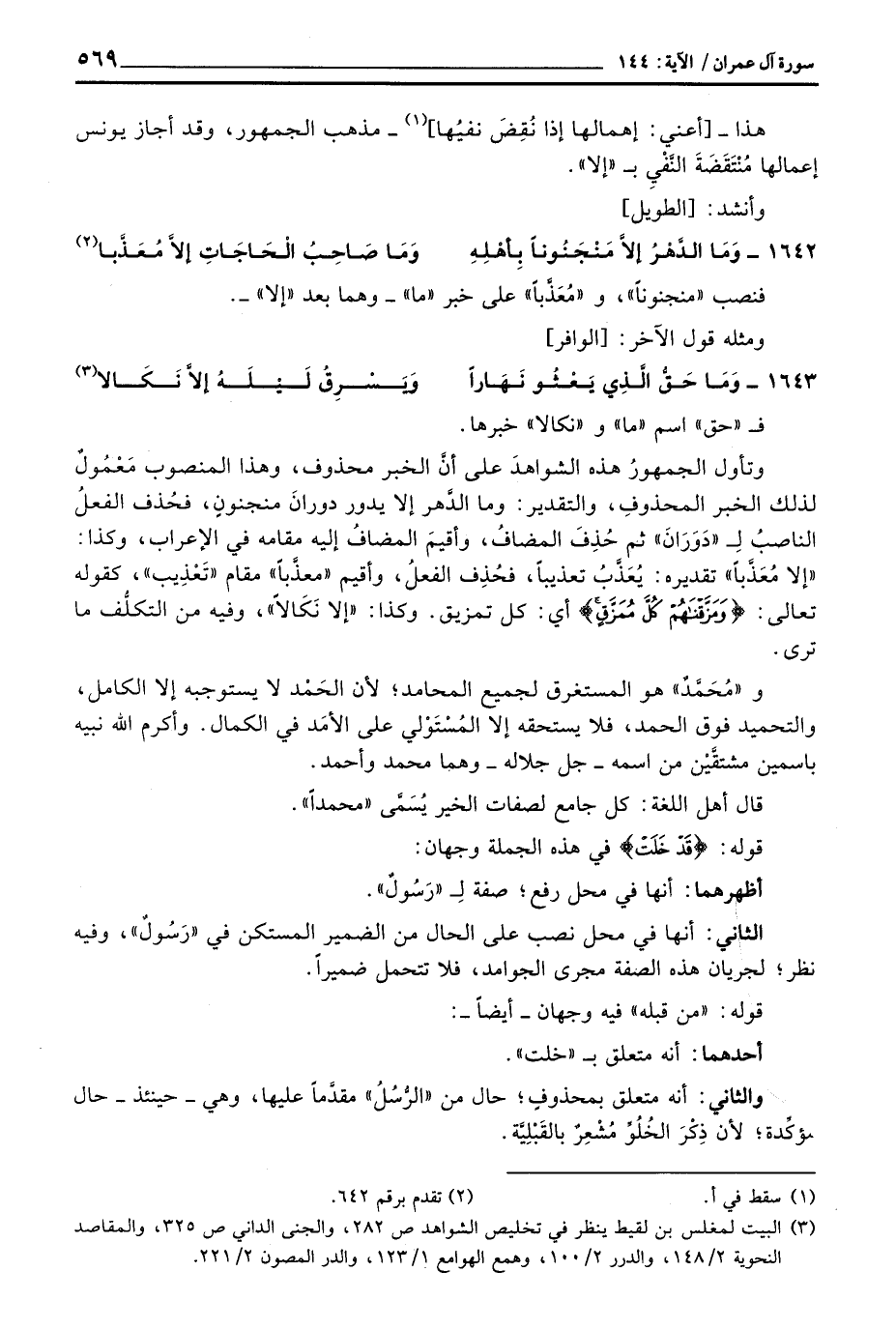 وتأول الجمهورُ هذه الشواهدَ على أنَّ الخبر محذوف، وهذا المنصوب مَعْمُولٌ لذلك الخبر المحذوفِ، والتقدير: وما الدَّهر إلا يدور دورانَ منجنونٍ، فحُذف الفعلُ الناصبُ لِ «دَوَرَانَ» ثم حُذِفَ المضافُ، وأقيمَ المضافُ إليه مقامه في الإعراب، وكذا: «إلا مُعَذَّباً» تقديره: يُعَذَّبُ تعذيباً، فحُذِف الفعلُ، وأقيم «معذَّباً» مقام «تَعْذِيب» ، كقوله تعالى: {وَمَزَّقْنَاهُمْ كُلَّ مُمَزَّقٍ} [سبأ: 19] أي: كل تمزيق. وكذا: «إلا نَكَالاً» ، وفيه من التكلُّف ما ترى.