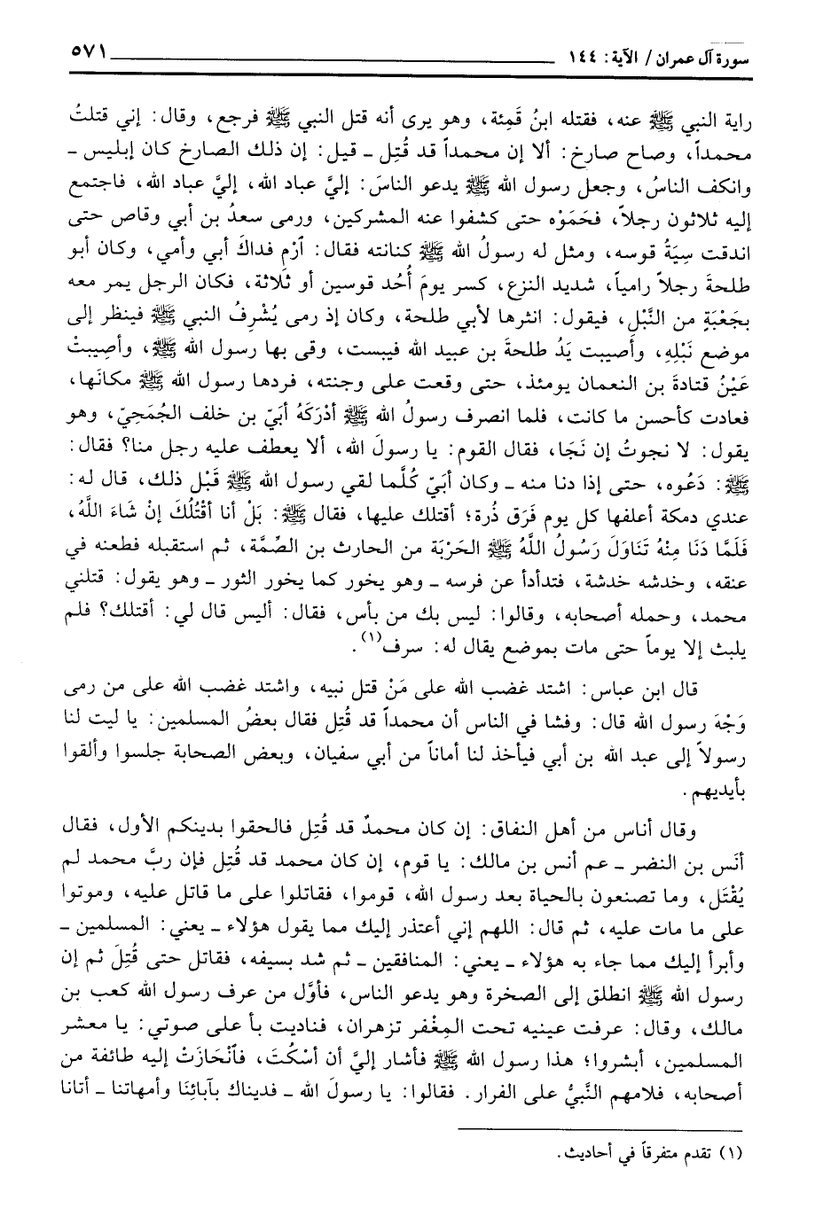 قال ابن عباس: اشتد غضب الله على مَنْ قتل نبيه، واشتد غضب الله على من رمى وَجْهَ رسول الله قال: وفشا في الناس أن محمداً قد قُتِل فقال بعضُ المسلمين: يا ليت لنا رسولاً غلى عبد الله بن أبي فيأخذ لنا أماناً من أبي سفيان، وبعض الصحابة جلسوا وألقوا بأيديهم.