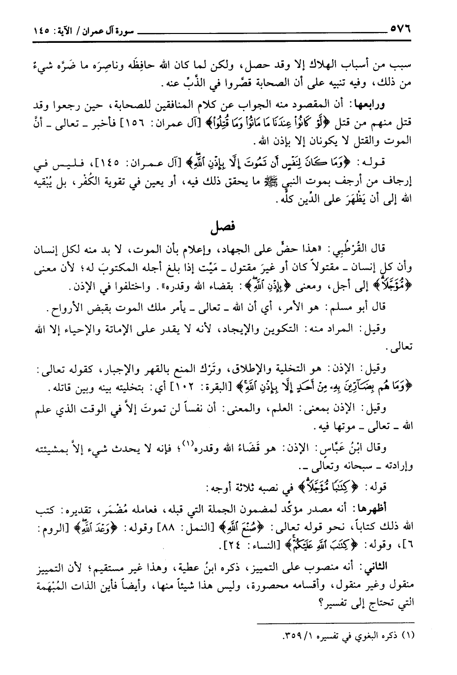 قال القُرْطُبِي: «هذا حضٌّ على الجهاد، وإعلام بأن الموت، لا بد منه لكل إنسان وأن كل إنسان - مقتولاً كان أو غيرَ مقتول - مَيِّت إذا بلغ أجله المتكوبَ له؛ لأن معنى {مُّؤَجَّلاً} إلى أجل، ومعنى {بِإِذْنِ الله} : بقضاء الله وقدره» . واختلفوا في الإذن.