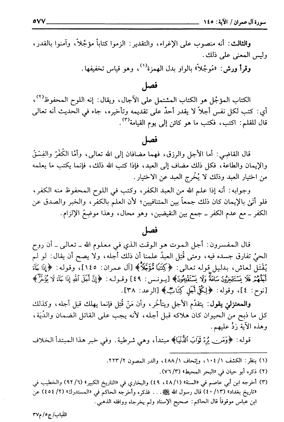 قال المفسرون: أجل الموت هو الوقت الذي في معلوم الله - تعالى - أن روح الحيِّ تفارق جيده فيه، ومتى قُتِل العبدُ علمنا أن ذلك أجله، ولا يصح أن يقال: لو لم يُقْتَل لعاش، بدليل قوله تعالى: {كِتَاباً مُّؤَجَّلاً} [آل عمران: 145] ، وقوله: {إِذَا جَآءَ أَجَلُهُمْ فَلاَ يَسْتَأْخِرُونَ سَاعَةً وَلاَ يَسْتَقْدِمُونَ} [يونس: 49] وقوله: {إِنَّ أَجَلَ الله إِذَا جَآءَ لاَ يُؤَخَّرُ} [نوح: 4] ، وقوله: {لِكُلِّ أَجَلٍ كِتَابٌ} [الرعد: 38] .